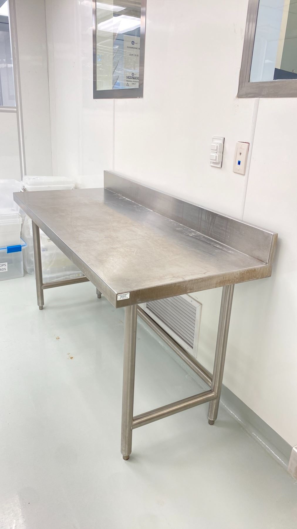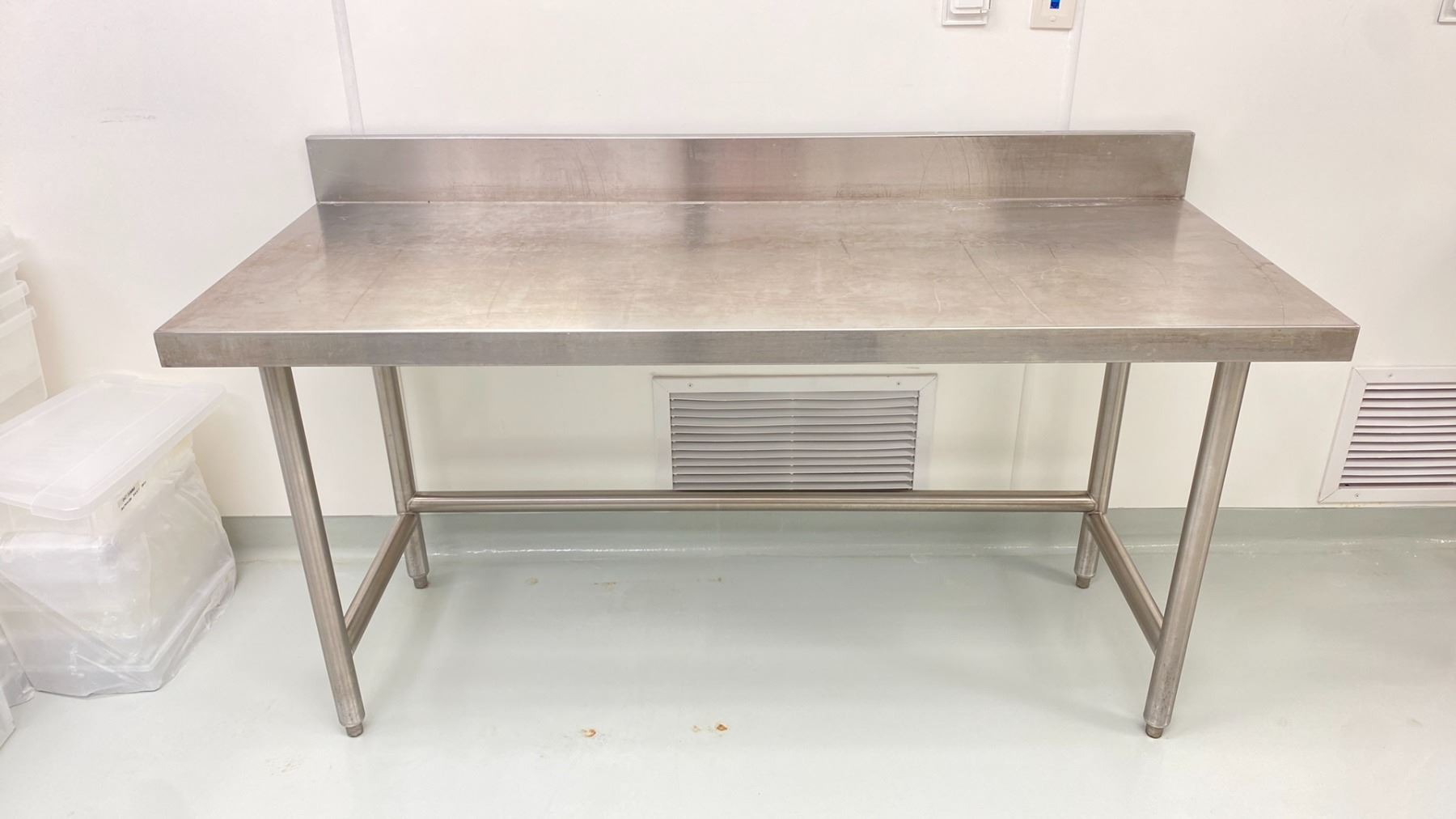 STAINLESS STEEL WORK TABLE WITH BACKSPLASH APPROX 5 X 2 X 2.5' WITH DUAL MONITOR MOUNT
