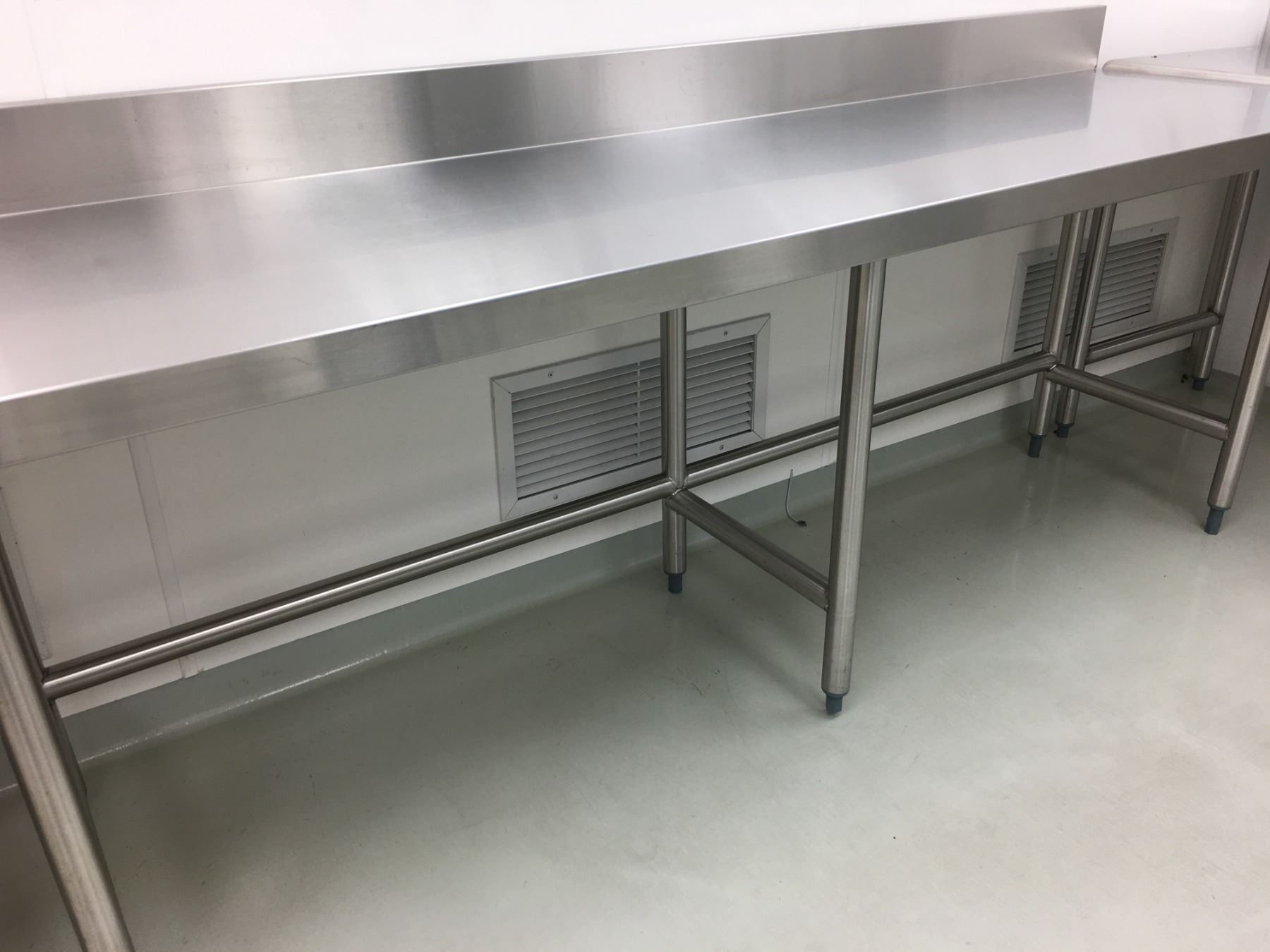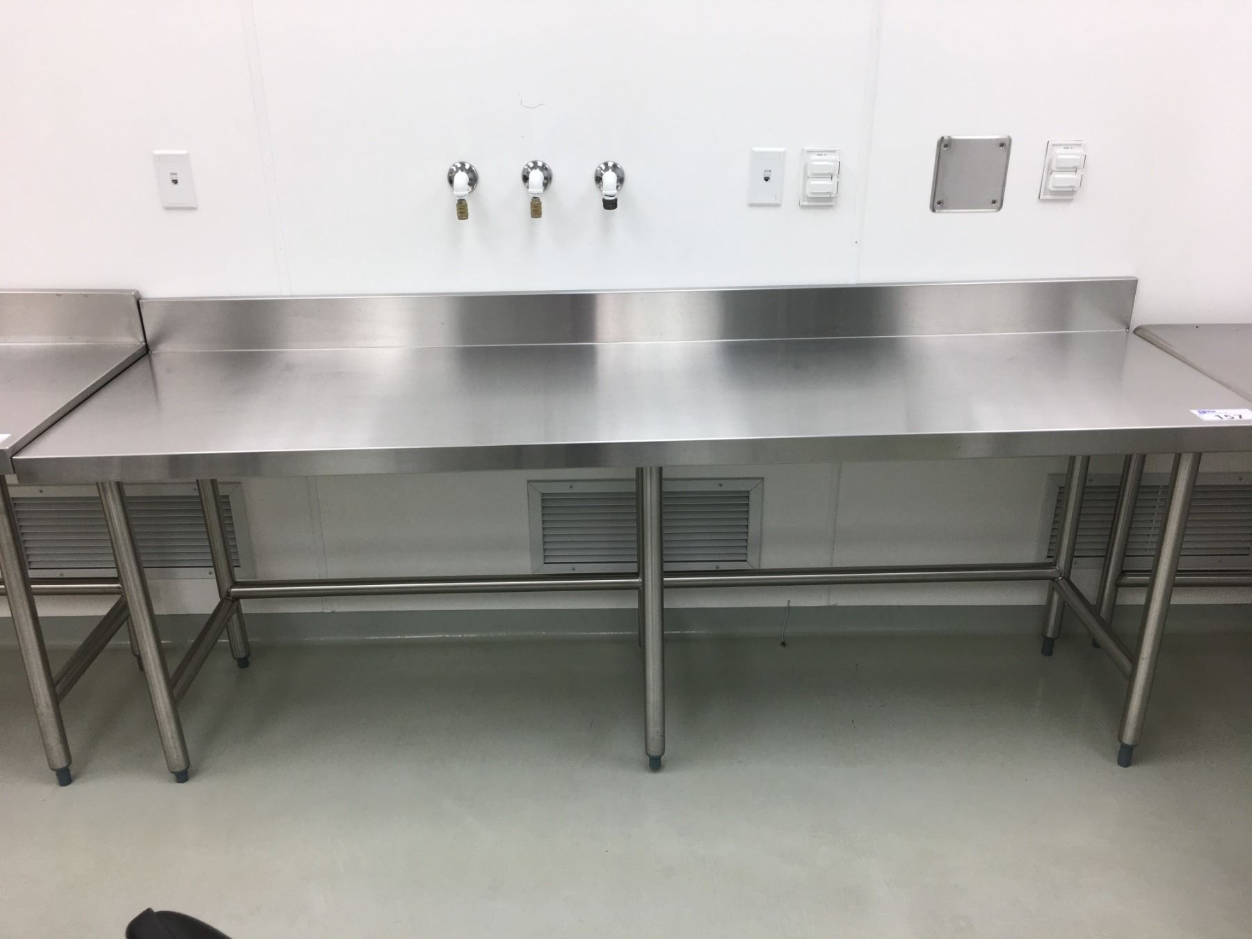 STAINLESS STEEL WORK TABLE WITH BACKSPLASH APPROX 7' LONG 2' HIGH 2' DEEP