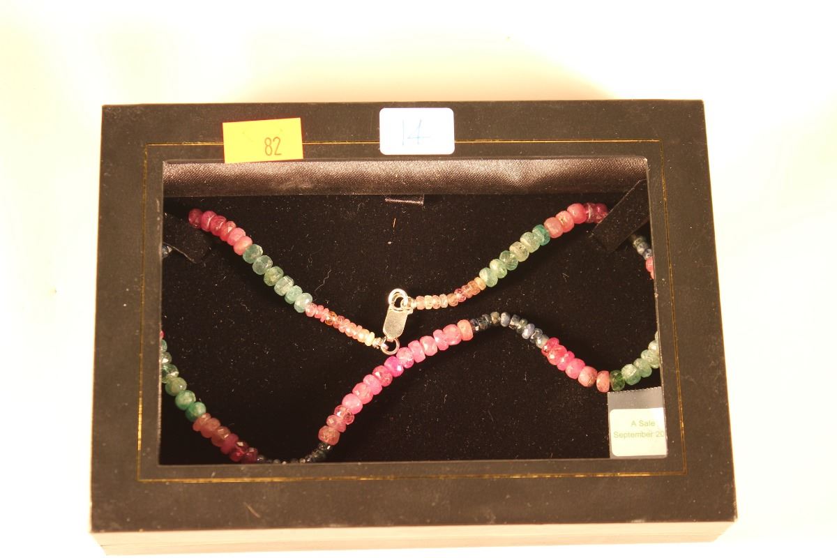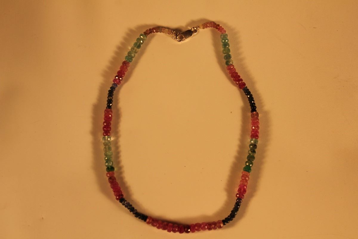 STAMPED 925 SILVER GEMSTONE NECKLACE, 60.00CT, 12.54GRAMS, BRIOLETTE - GEMSTONE, MODERATELY-HEAVILY INCLUDED, COLOR - BLUE, GREEN, RED. NATURAL SAPPHIRE, NATURAL EMERALD, NATURAL RUBY