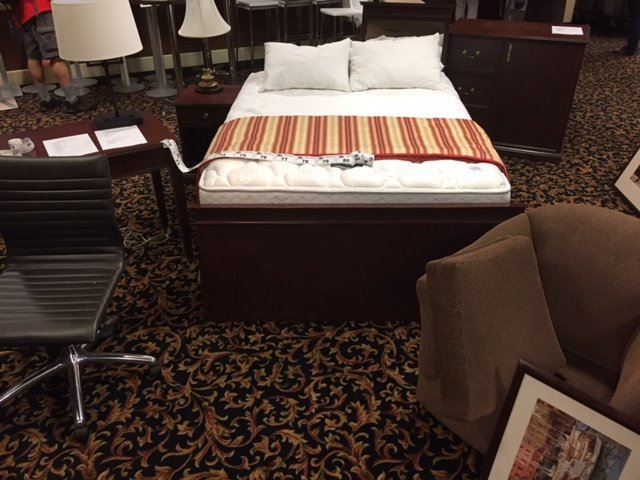 STANDARD ROOM PACKAGE INCLUDING: 2 QUEEN OR 2 DOUBLES (FIRST CHOICE GIVEN AT TIME OF PICK UP) WITH HEADBOARDS, 4 PILLOWS, BUCKET CHAIR, DESK WITH CHAIR, LAMP, TV ARMOIR, 2 PRINTS, 1 SMALL MIRROR