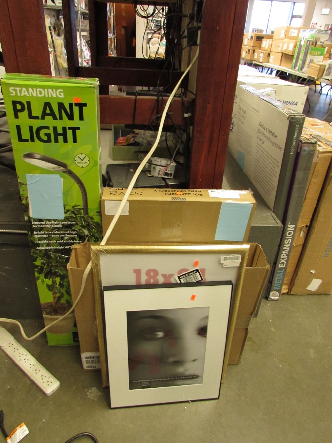 STANDING PLANT LIGHT, SHOE RACK, PICTURE FRAMES, MISC