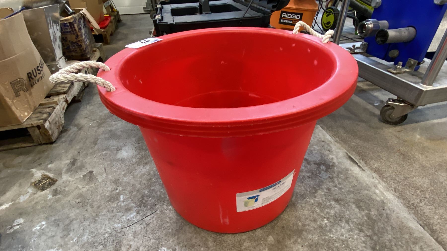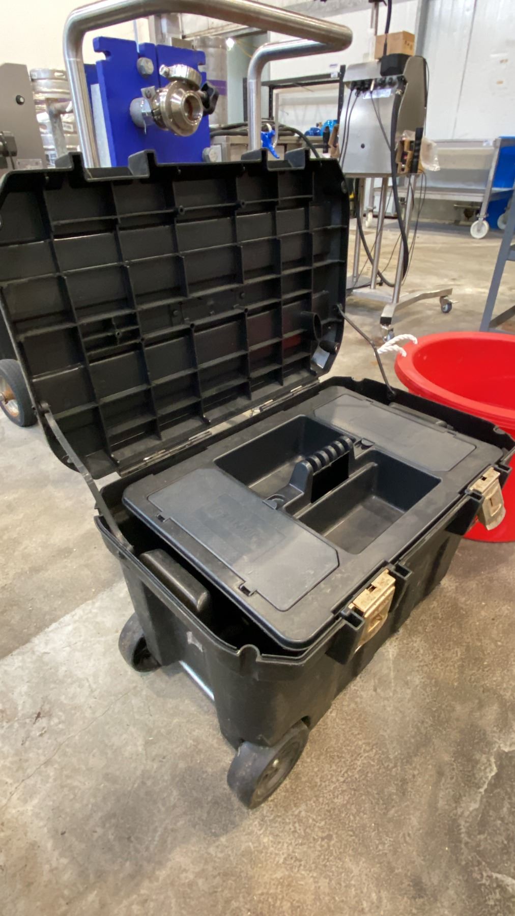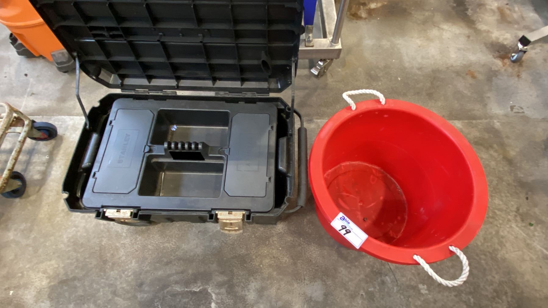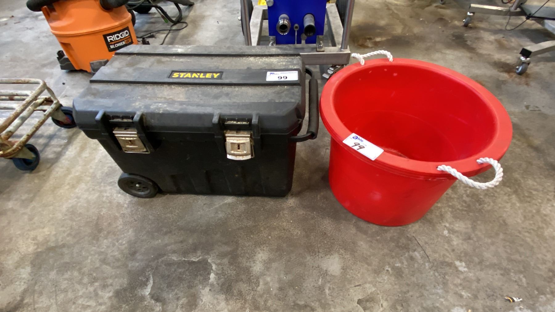 STANLEY MOBILE ROLLING TOOL CHEST AND RED PLASTIC UTILITY TUB