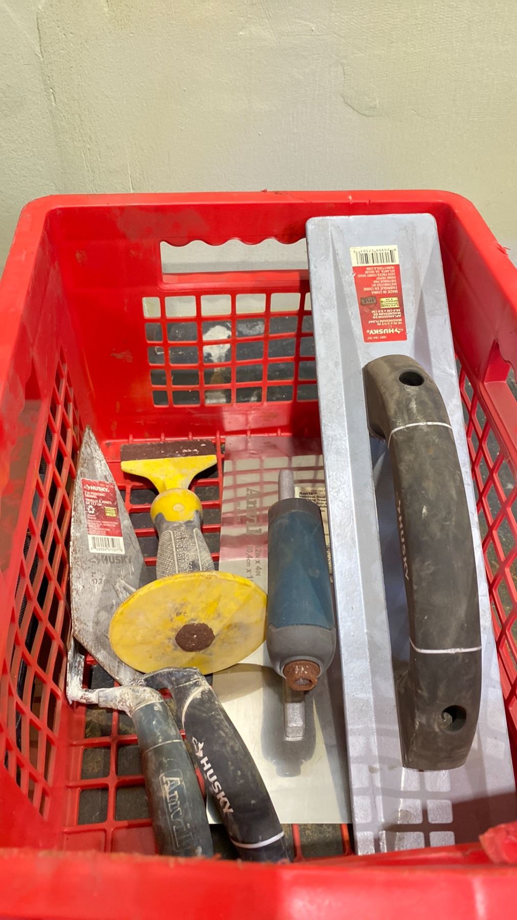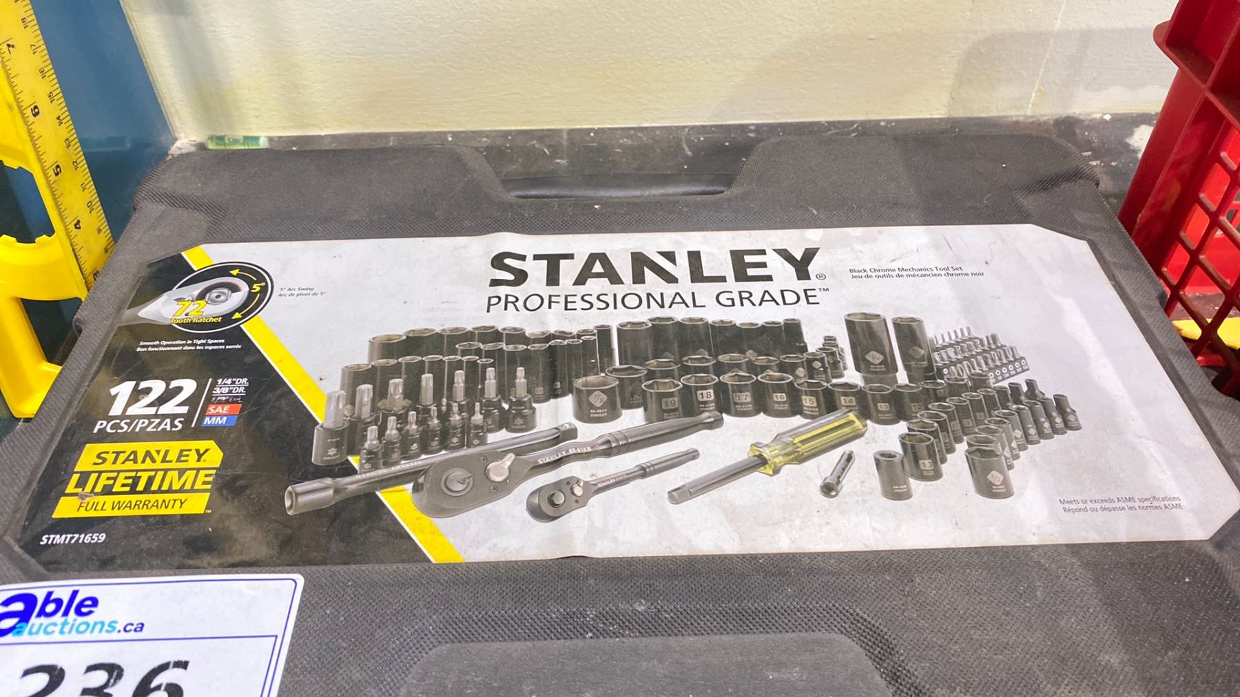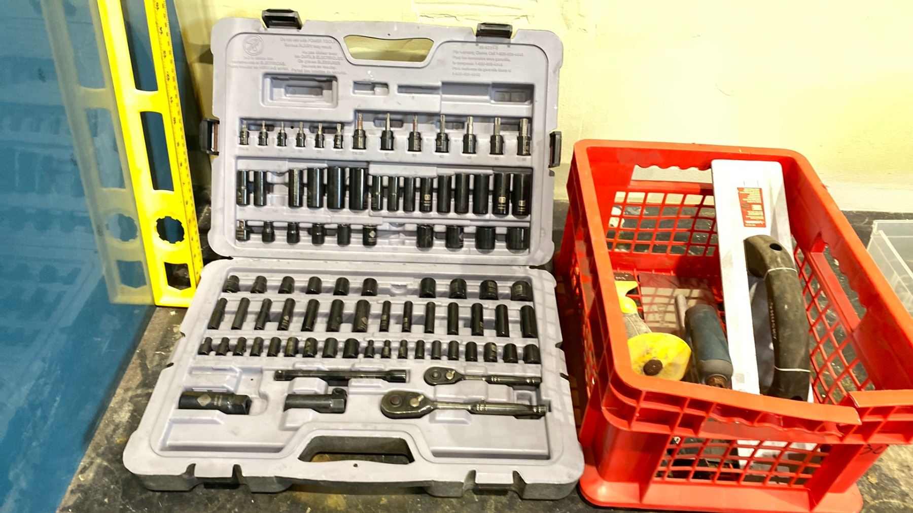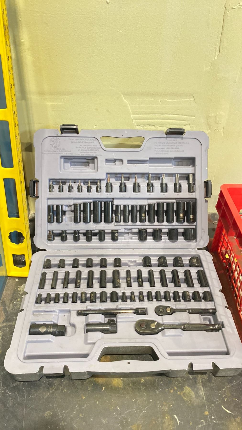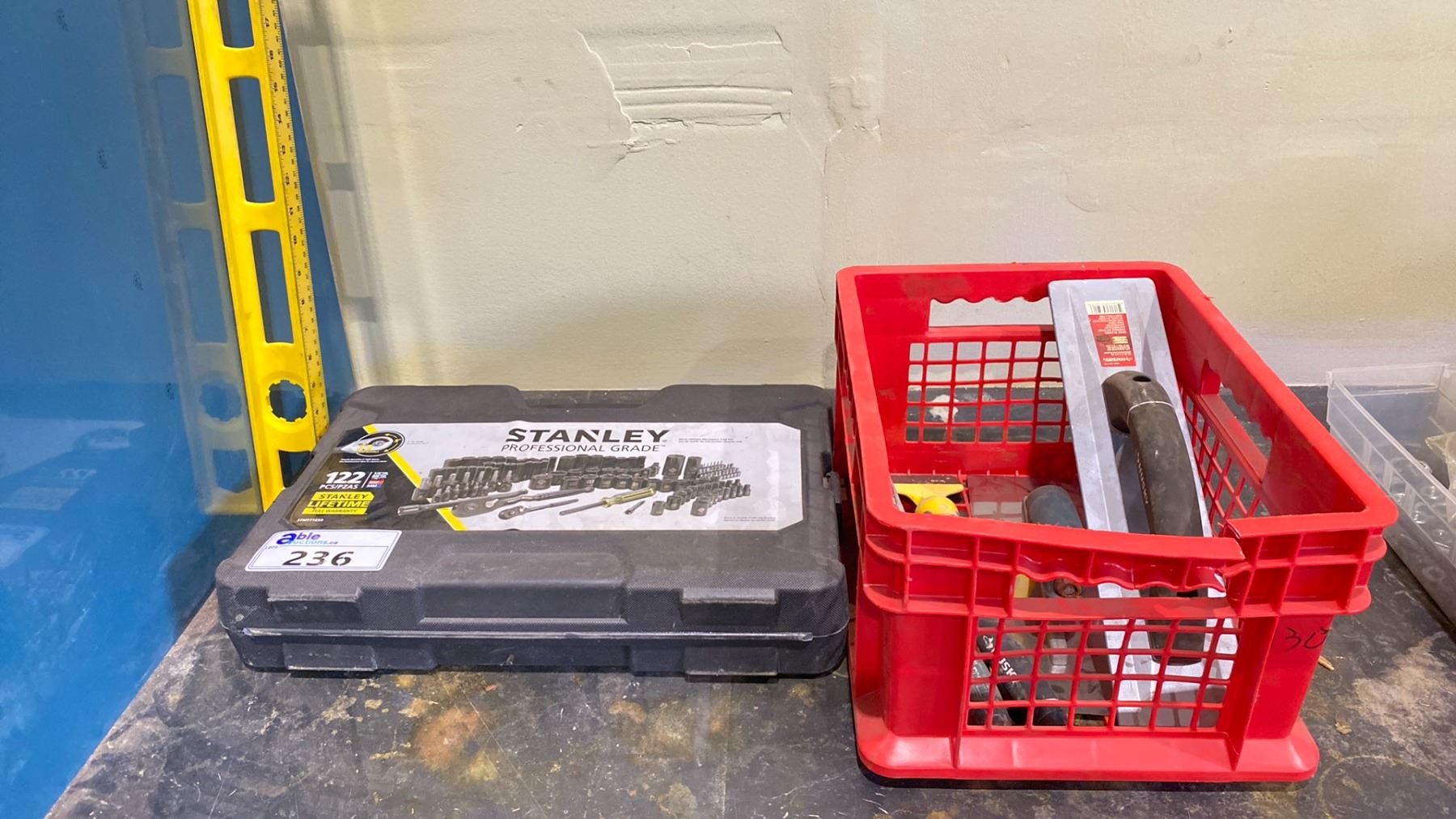 STANLEY PROFESSIONAL GRADE 122 PC SOCKET SET & RED BASKET OF CONCRETE TROWELS & CHIPPING TOOLS & CARPENTERS LEVEL