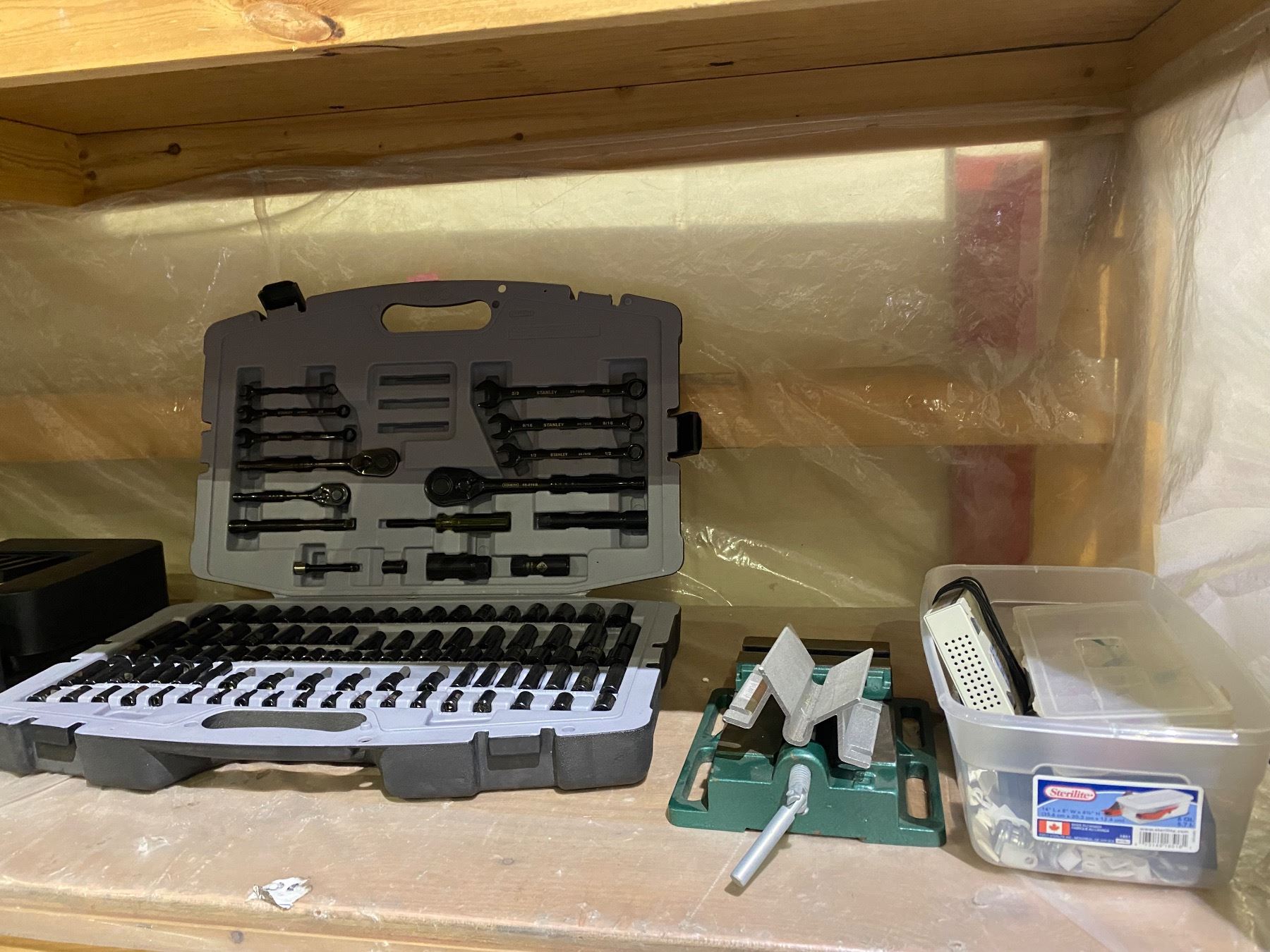 STANLEY SOCKET SET, BENCH VICE AND ASSORTED HARDWARE