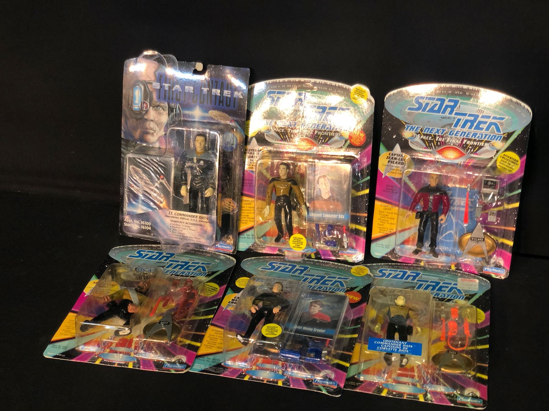 STAR TREK FIGURINES INC. 5 THE NEXT GENERATION FIGURINES AND 1 FIRST CONTACT FIGURINE, ALL IN ORIGINAL PACKAGING