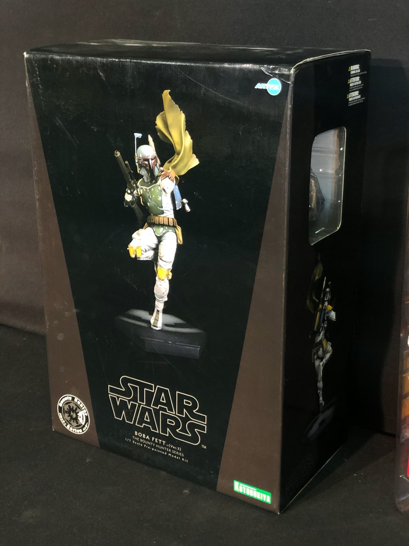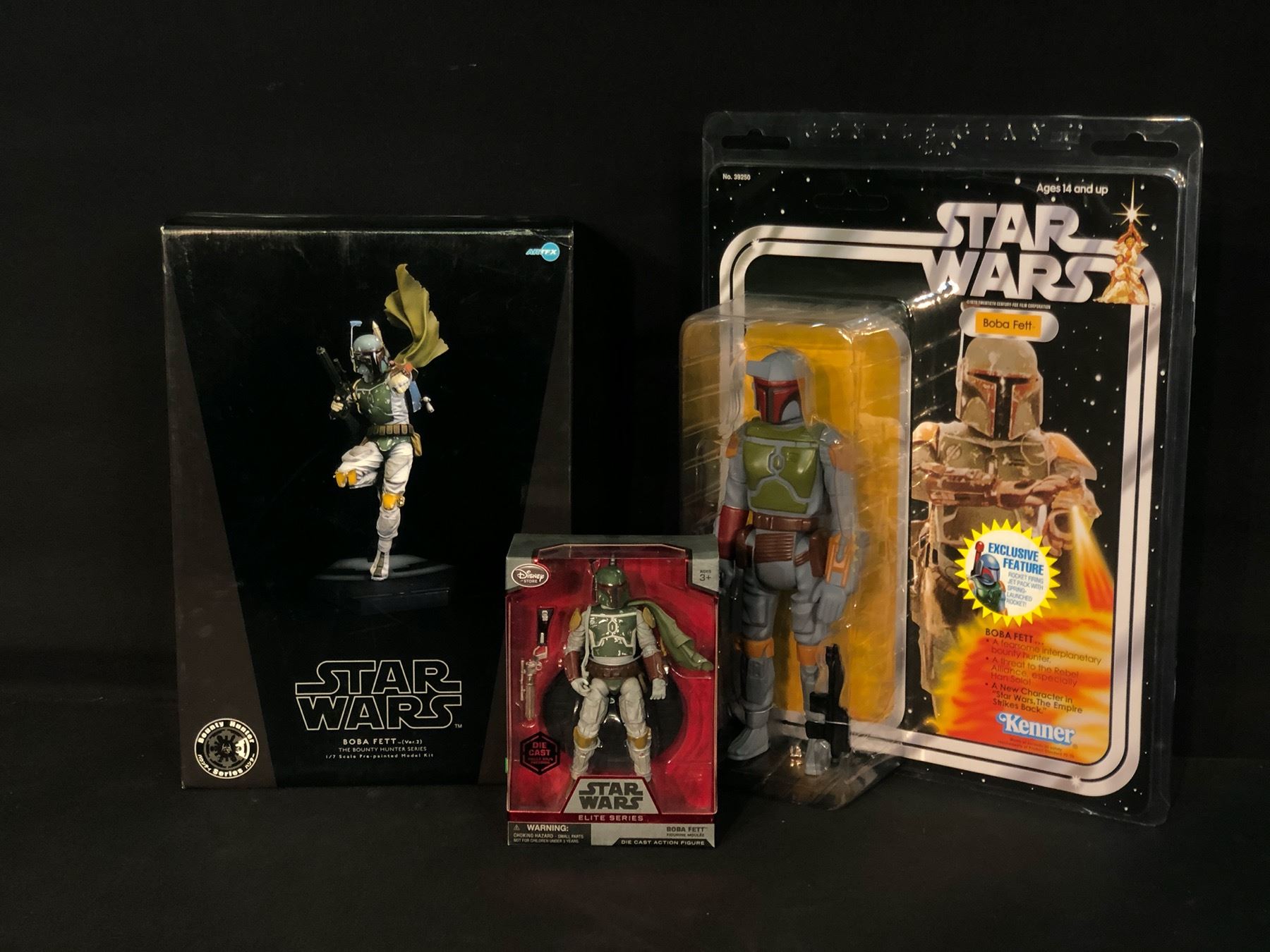 STAR WARS MEMORABILIA INC. BOBA FETT VER. 2 BOUNTY HUNTER SERIES 1/7 SCALE PRE-PAINTED MODEL KIT, BOBA FETT ACTION FIGURE BY KENNER, AND DISNEY ELITE SERIES BOBA FETT FIGURINE, ALL IN ORIGINAL PACKAGING