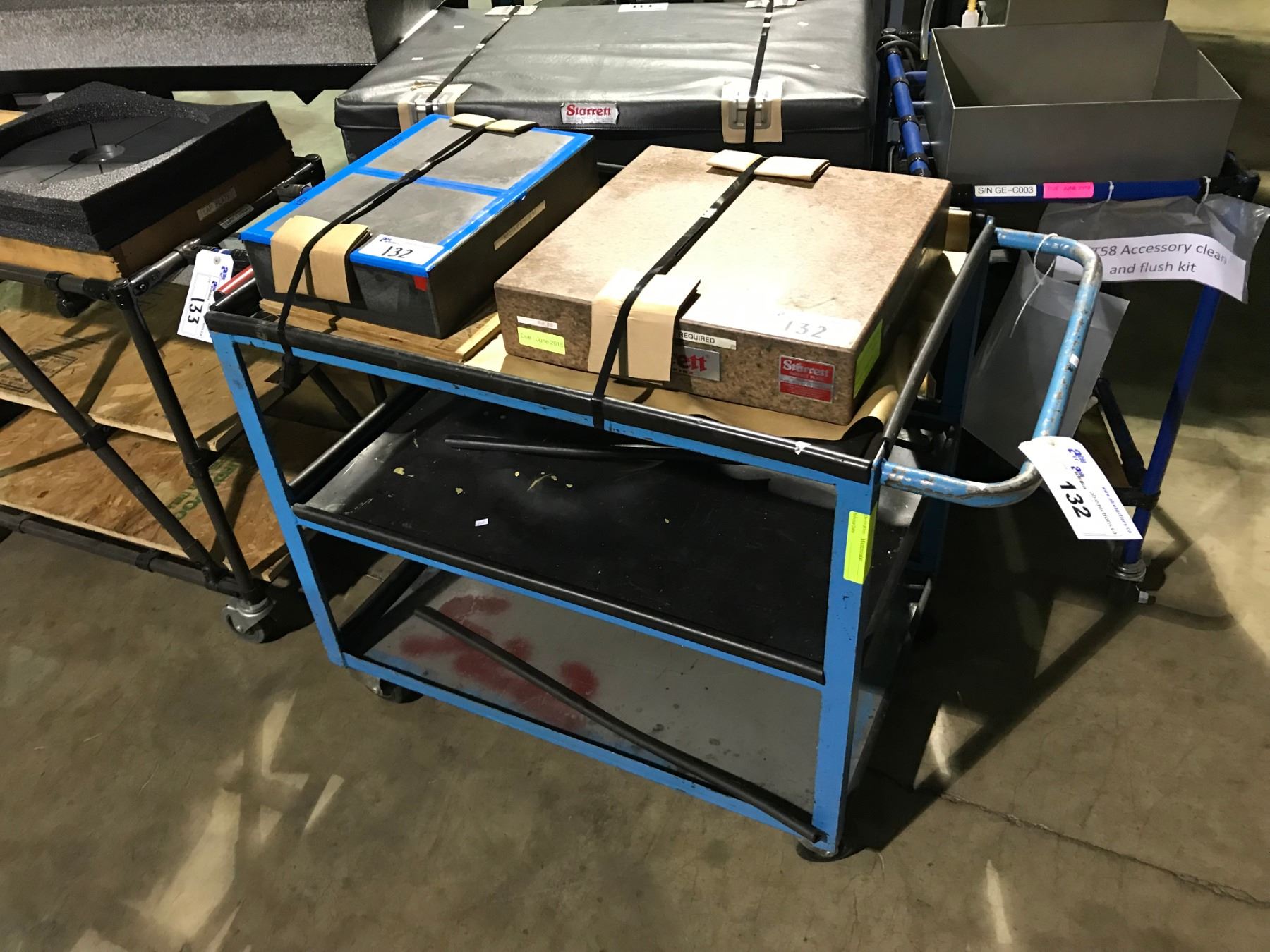 STARRETT 18" X 18" X 4" GRANITE TESTING SURFACE & 18" X 12" X 4" GRANITE TESTING SURFACE ON BLUE METAL 3 TIER MOBILE SHOP CART