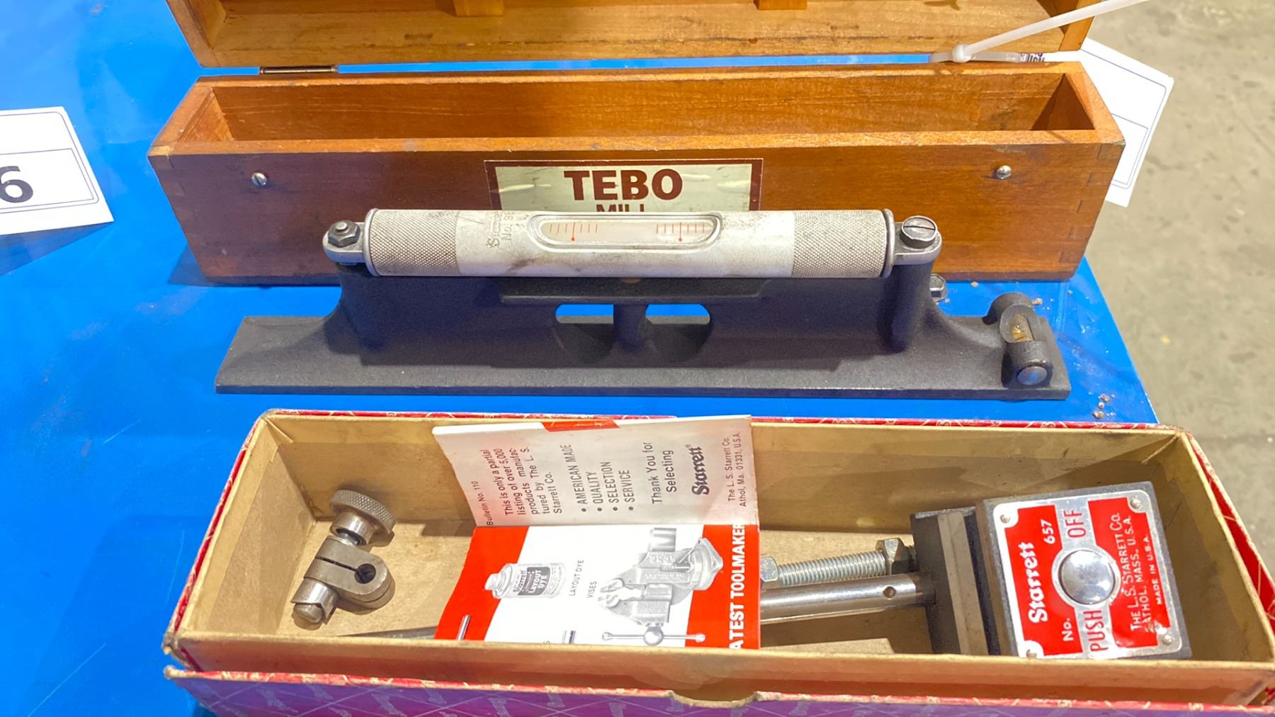 STARRETT NO.98 MACHINIST LEVEL IN A WOODEN CASE & STARRETT MAGNETIC DIAL INDICATOR BASE