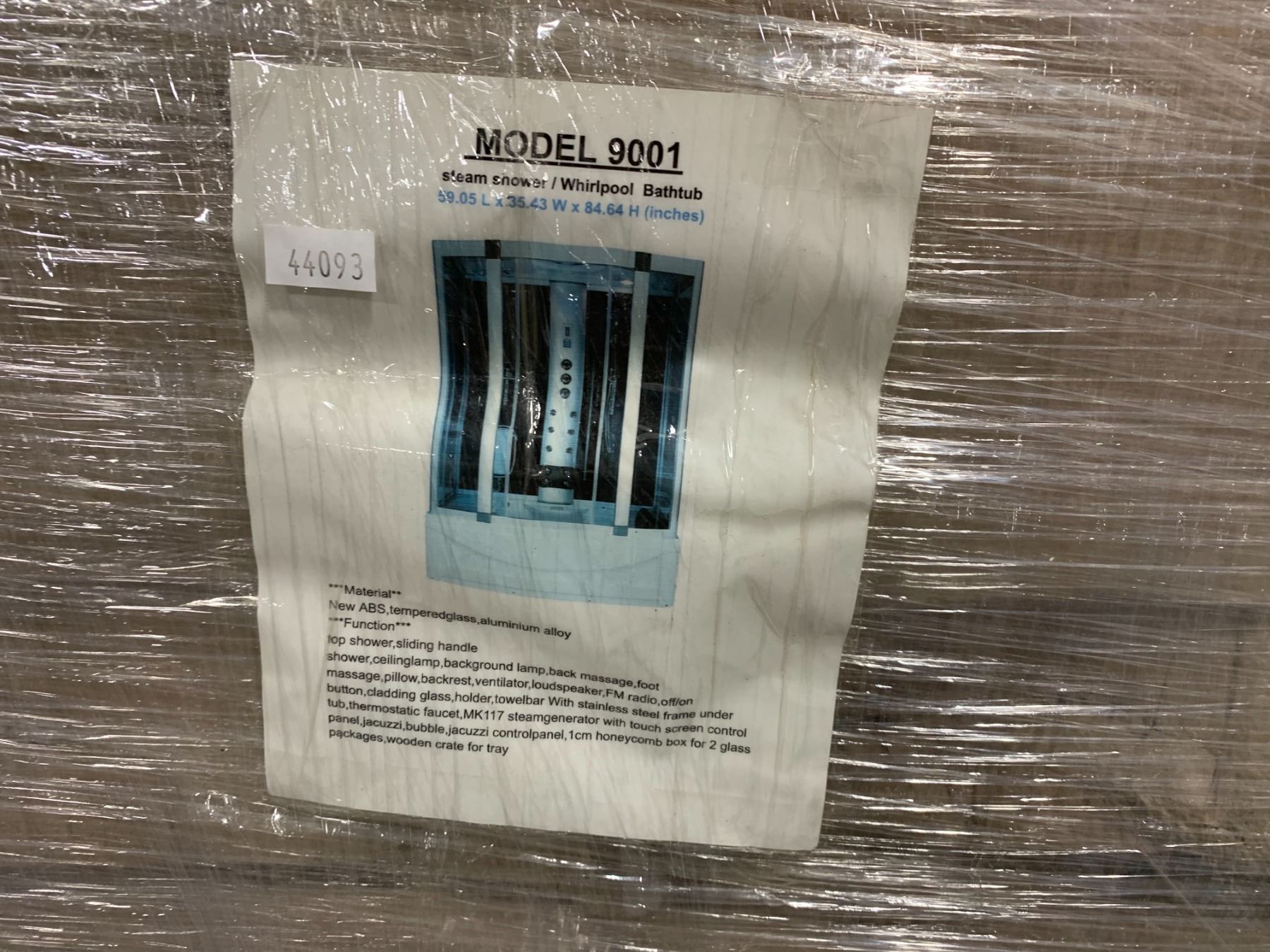 STEAM SHOWER/ WHIRLPOOL BATHTUB MODEL#9001 IN PALLET, DIMENSION: 59.05"L X 35.43"W X 84.64"H MATERIAL: ABS, TEMPERED GLASS, ALUMINUM ALLOY. FUNCTION: TOP SHOWER, SLIDING HANDLE, SHOWER, CEILING LAMP, BACKGROUND LAMP, BACK MESSAGE, FOOT MESSAGE, PILLOW BACKREST, VENTILATOR, LOUDSPEAKER, FM RADIO, OFF/ON BUTTON, CLADDING GLASS, HOLDER, TOUCH SCREEN CONTROL PANEL & MORE