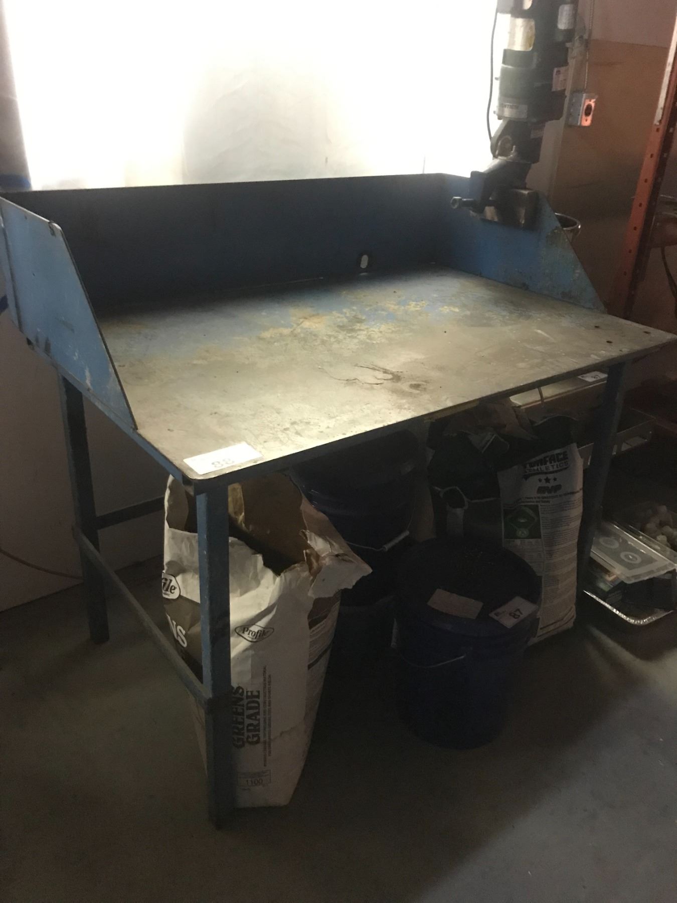 STEEL WORK TABLE - 1/4" THICK TOP APPROX. 4FT ACROSS X 2 1/2FT HIGH X 2 1/2FT WIDE