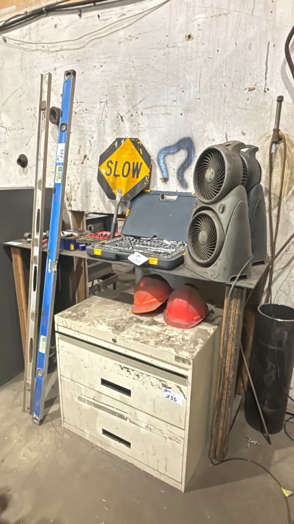 STEEL WORK TABLE WITH ASSORTED TOOLS, PUNCH SETS, CHUCKS, FILING CABINET AND