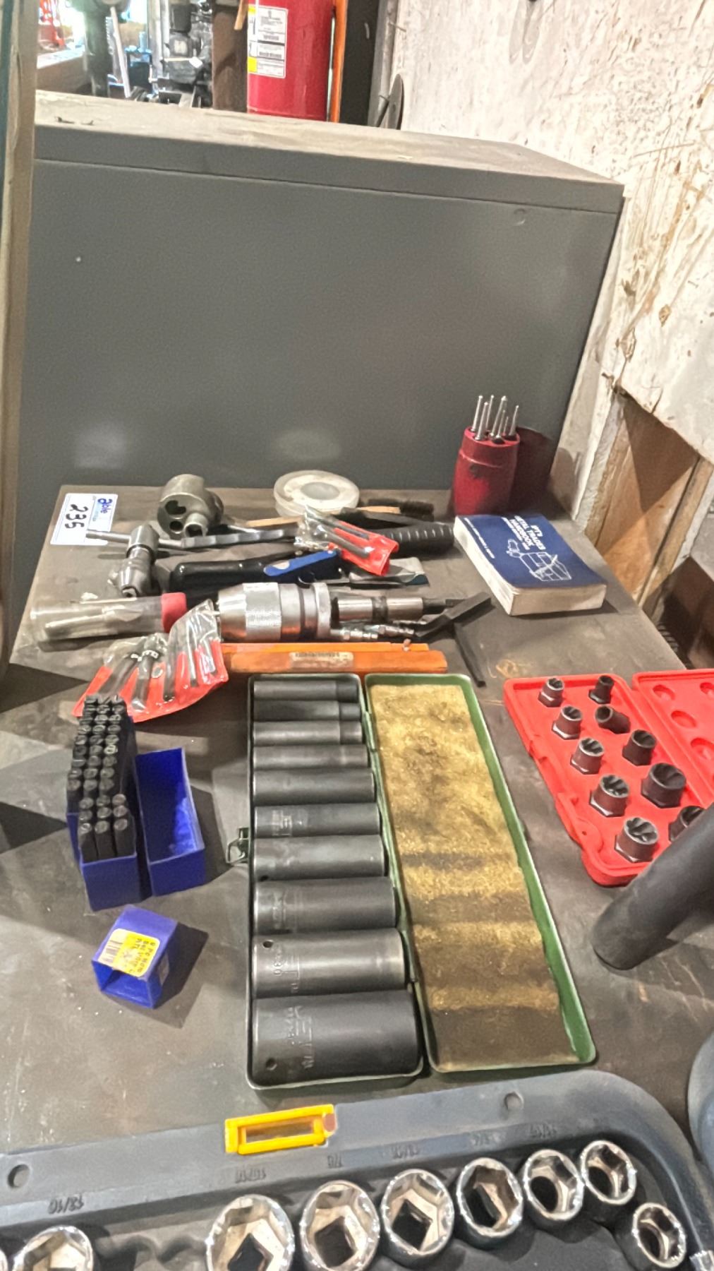 STEEL WORK TABLE WITH ASSORTED TOOLS, PUNCH SETS, CHUCKS, FILING CABINET AND MISCELLANEOUS ITEMS