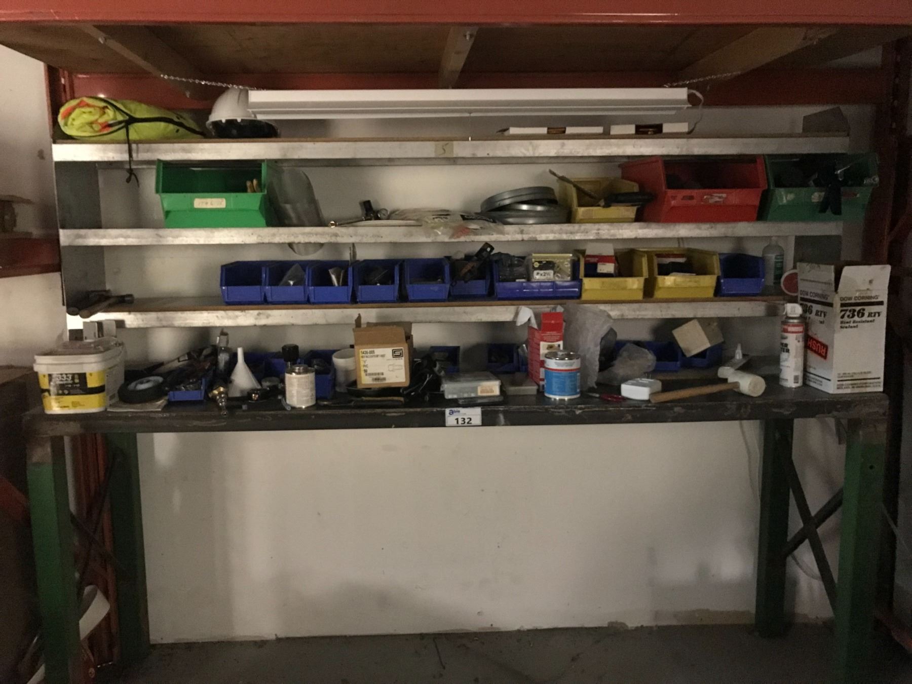 STEEL WORK TABLE WITH SHELVES AND ASSORTED TOOLS, HARDWARE,ETC-APPROX.8FT W X 6 1/2FT T X 2FT D