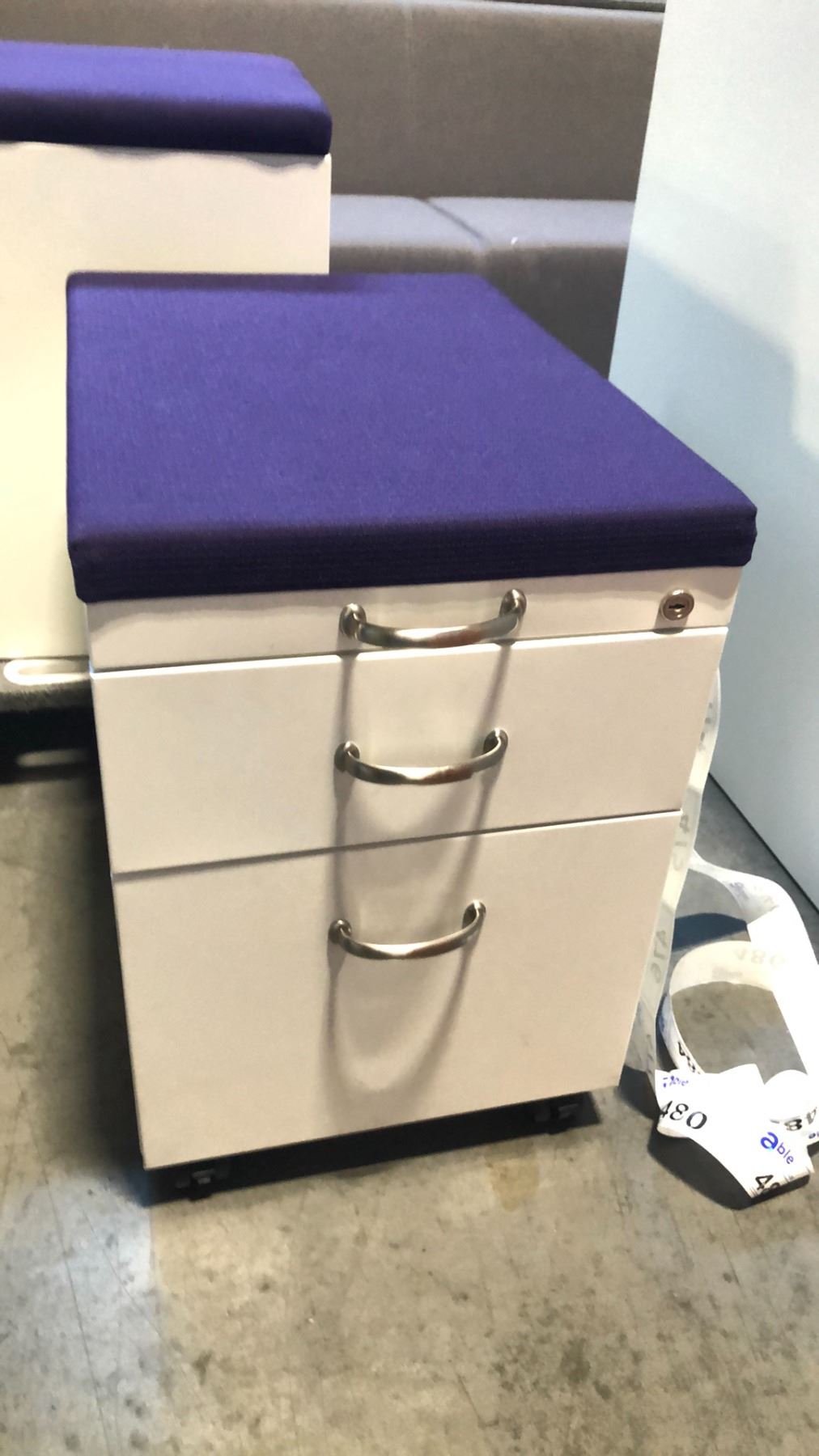 STEELCASE BEIGE 2 DRAWER PURPLE CUSHION TOP MOBILE PEDESTAL