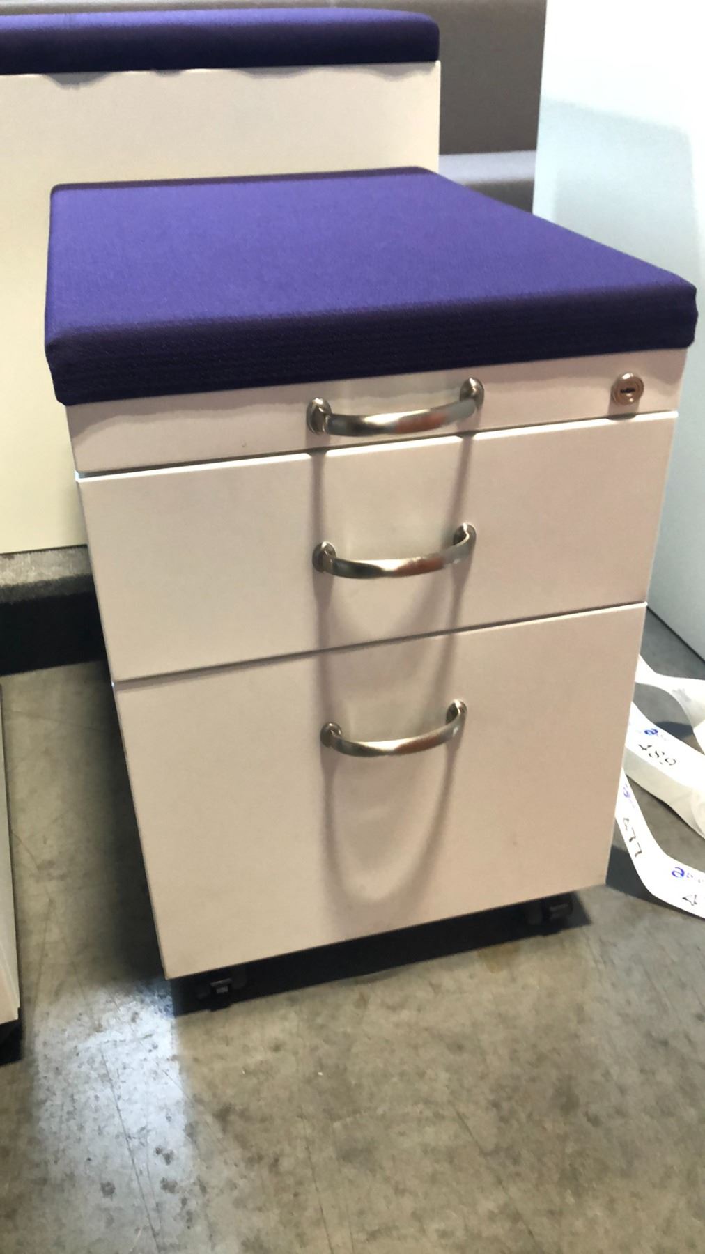 STEELCASE BEIGE 2 DRAWER PURPLE CUSHION TOP MOBILE PEDESTAL