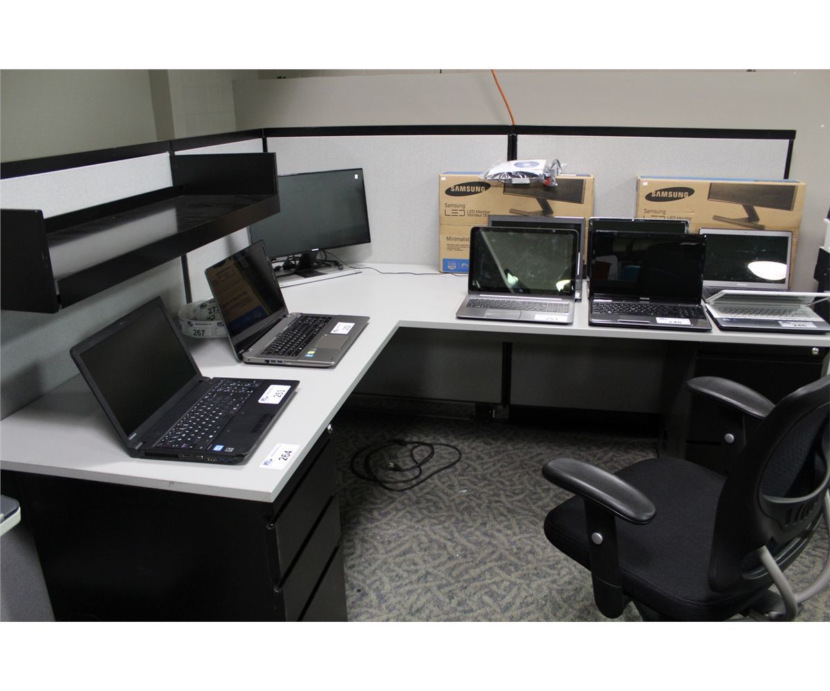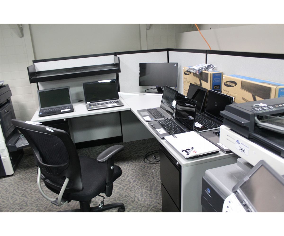 STEELCASE GREY AND BLACK 7' X 6' CORNER WORKSTATION C/W OVERHEAD SHELF