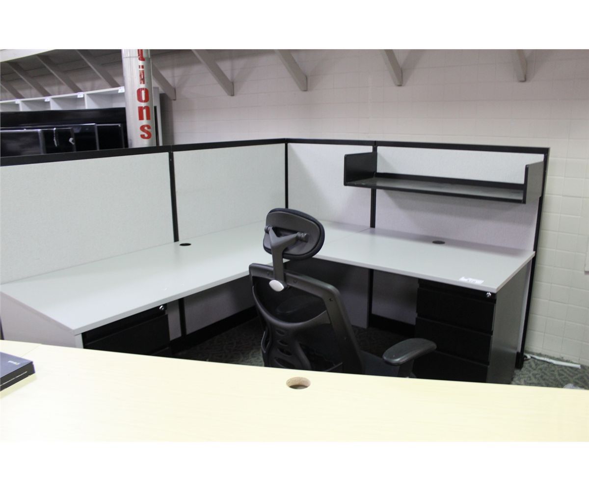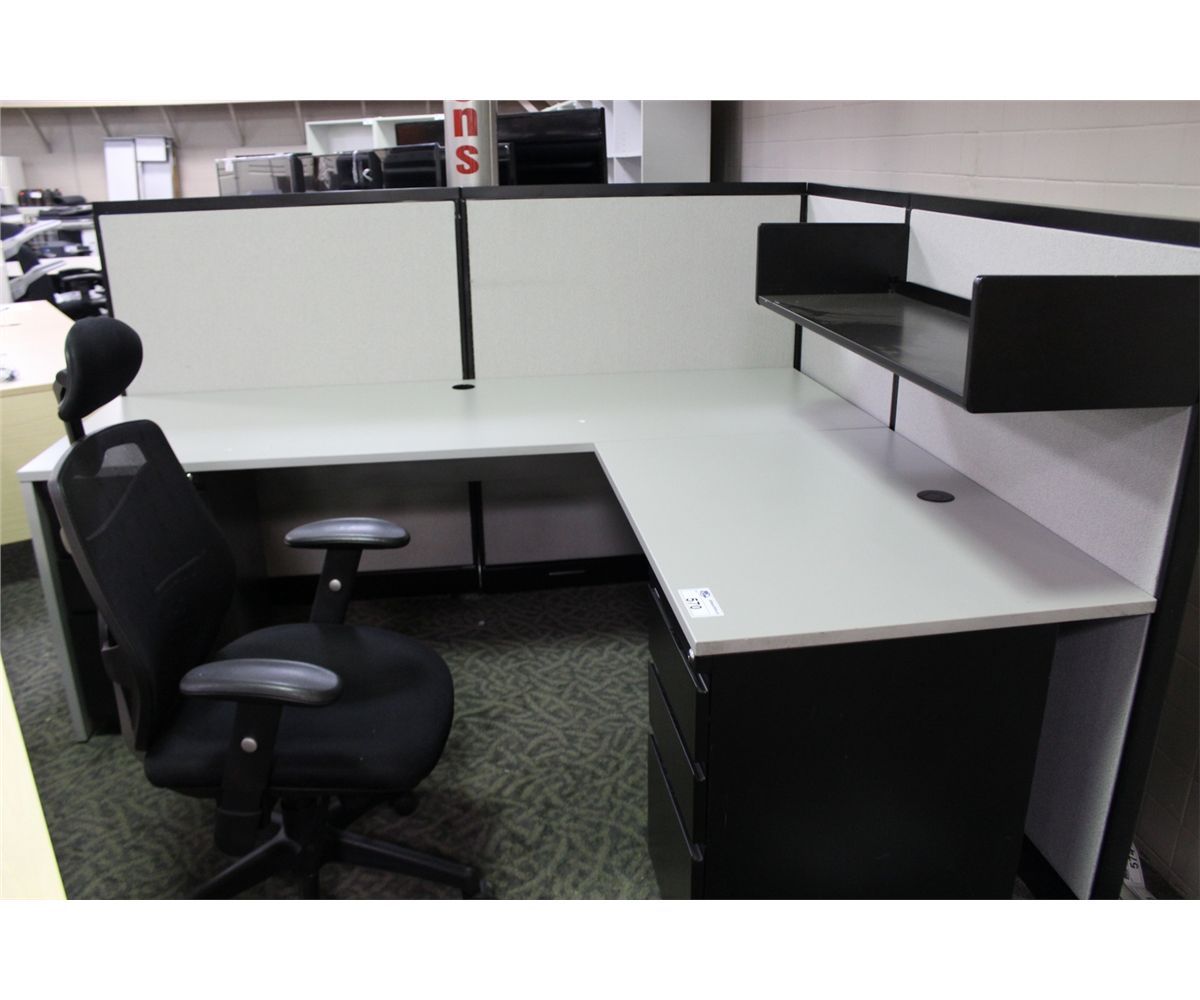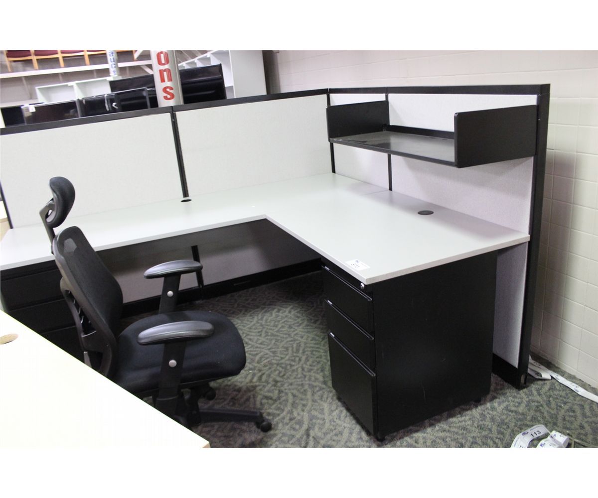 STEELCASE GREY AND BLACK 7' X 6' CORNER WORKSTATION C/W OVERHEAD SHELF