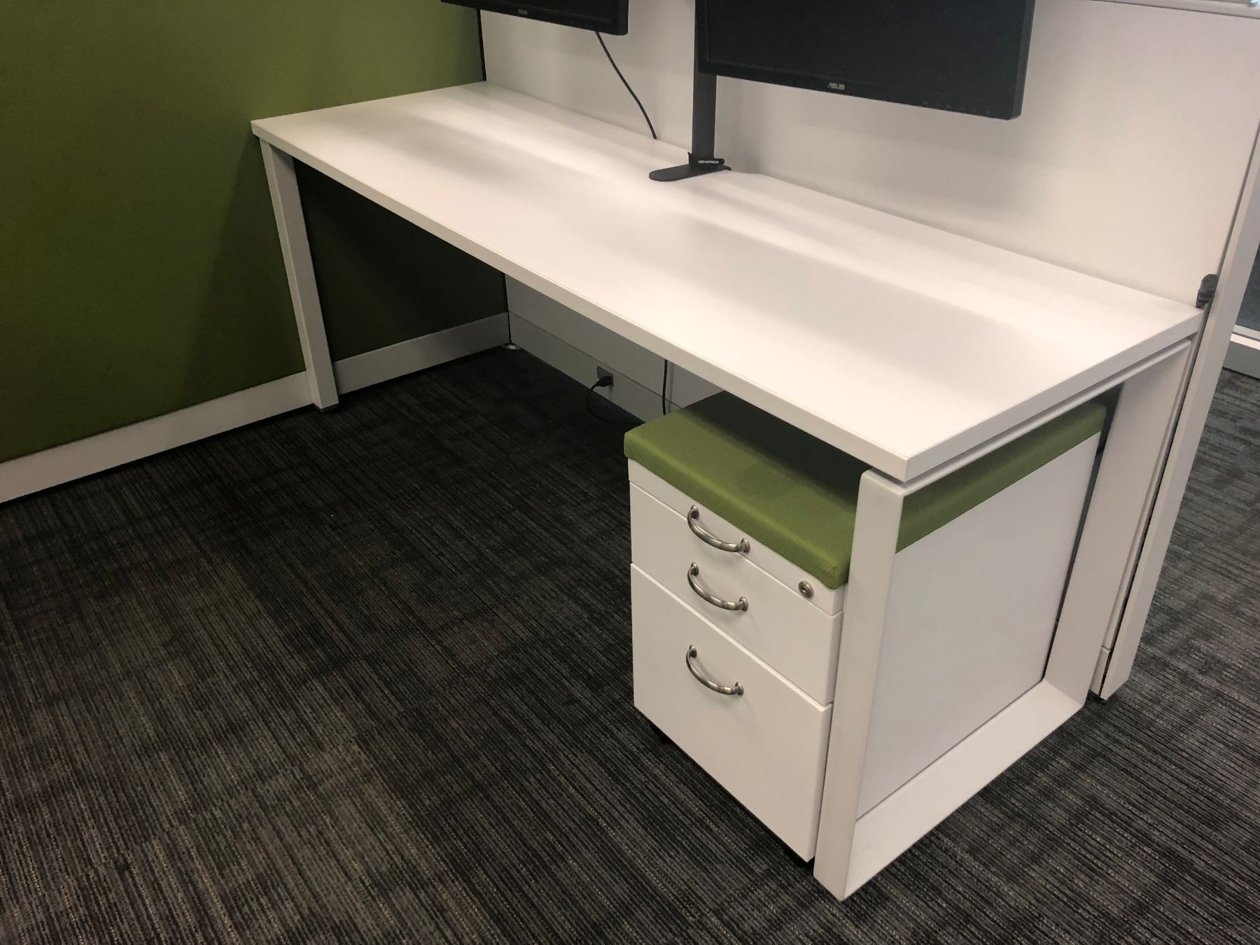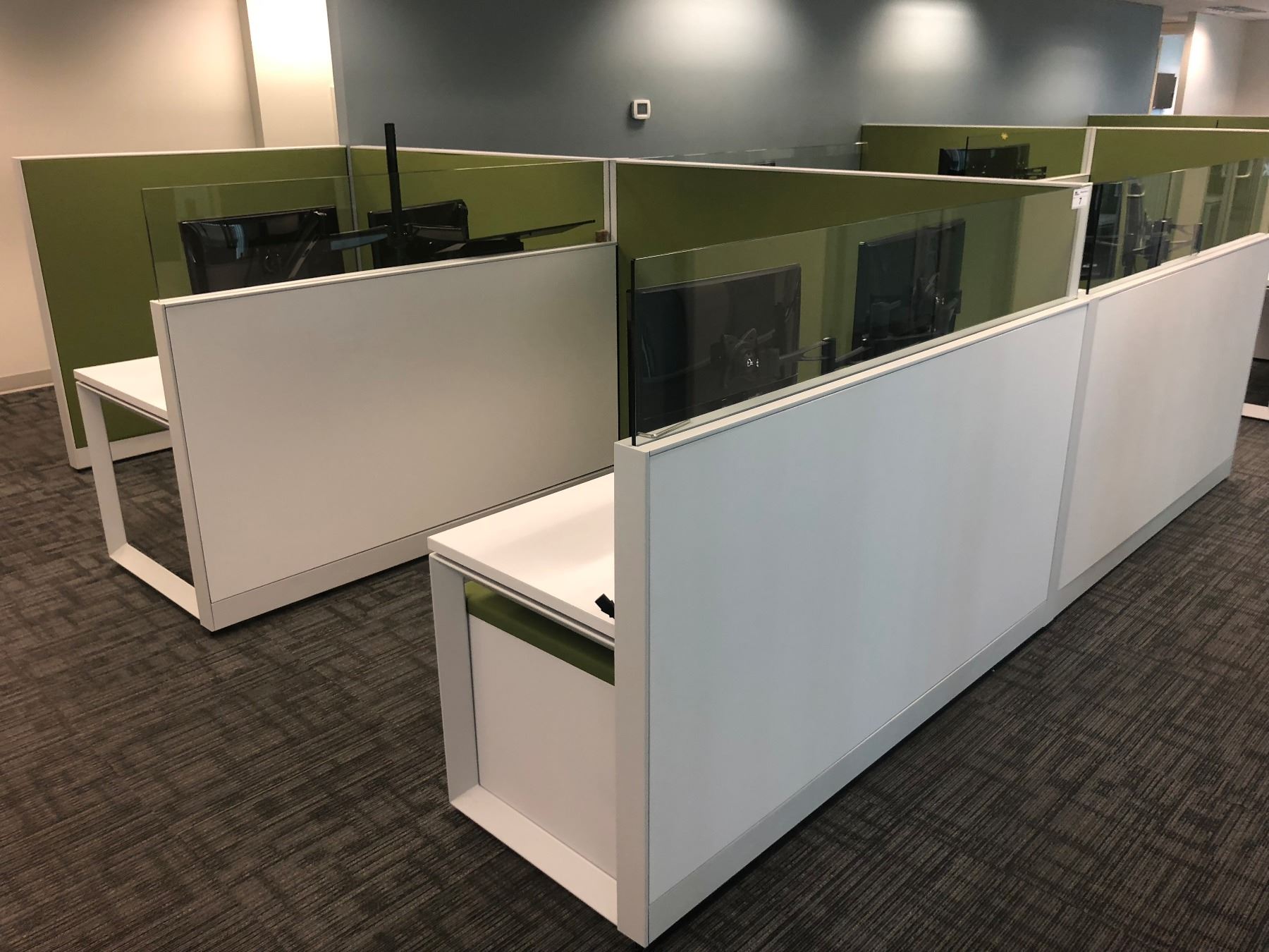 STEELCASE TURNSTONE 4 PERSON WHITE / GREEN OFFICE CUBICLE WITH GLASS PANEL DIVIDERS, AND PEDESTALS