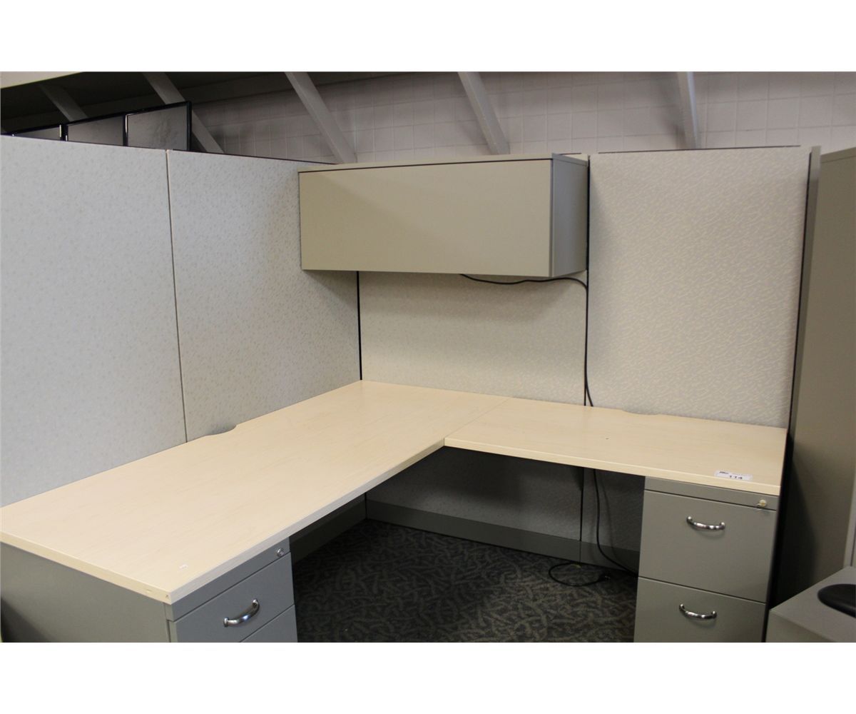 STEELCASE TURNSTONE MAPLE AND GREY CORNER WORKSTATION COMES W/ OVERHEAD STORAGE