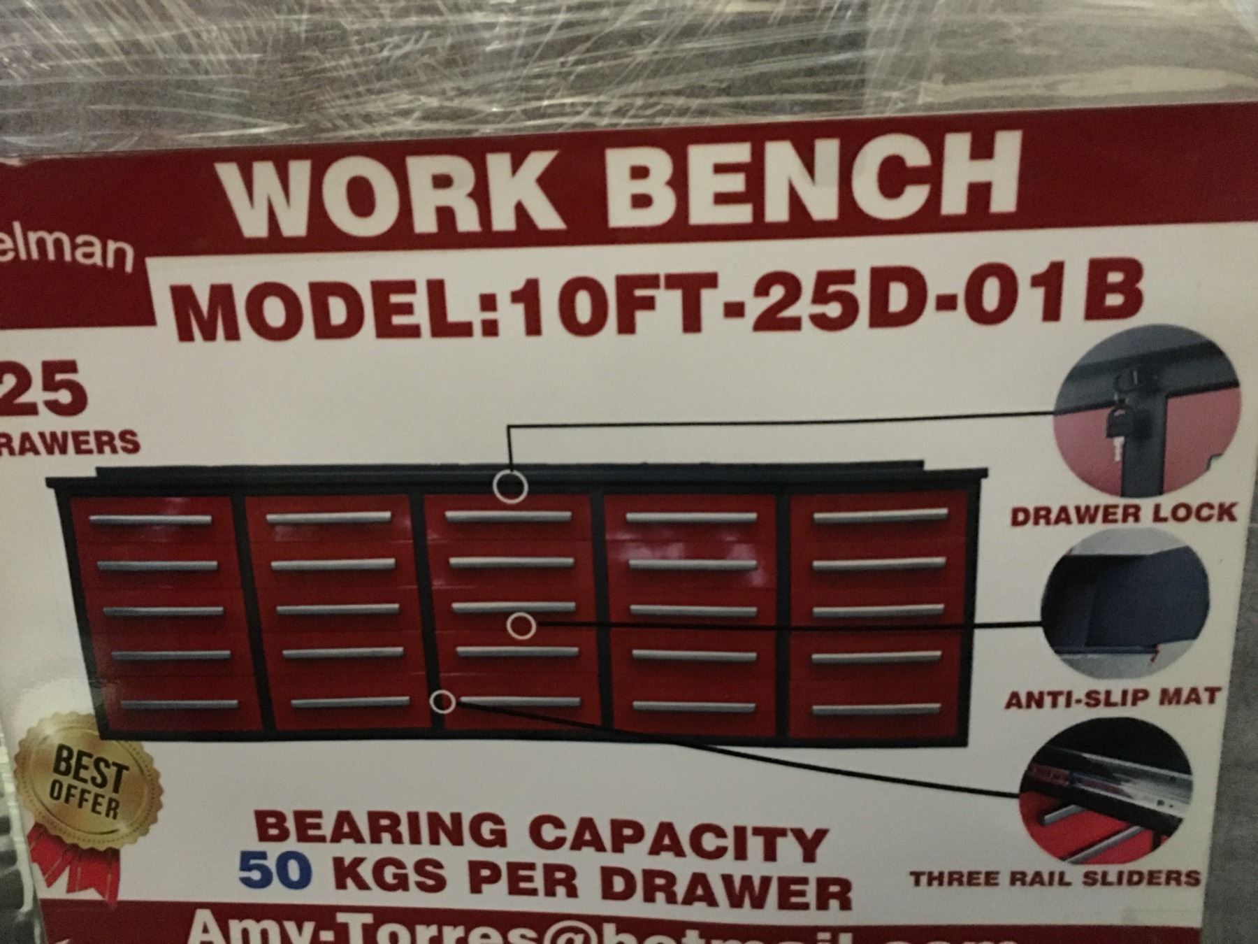 STEELMAN 10' WORK BENCH WITH 25' DRAWERS (RED) WITH LOCKS & ANTI-SLIP LINERS - USING NEW 3-RAIL SLIDING