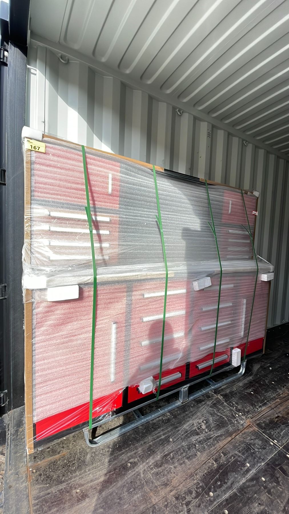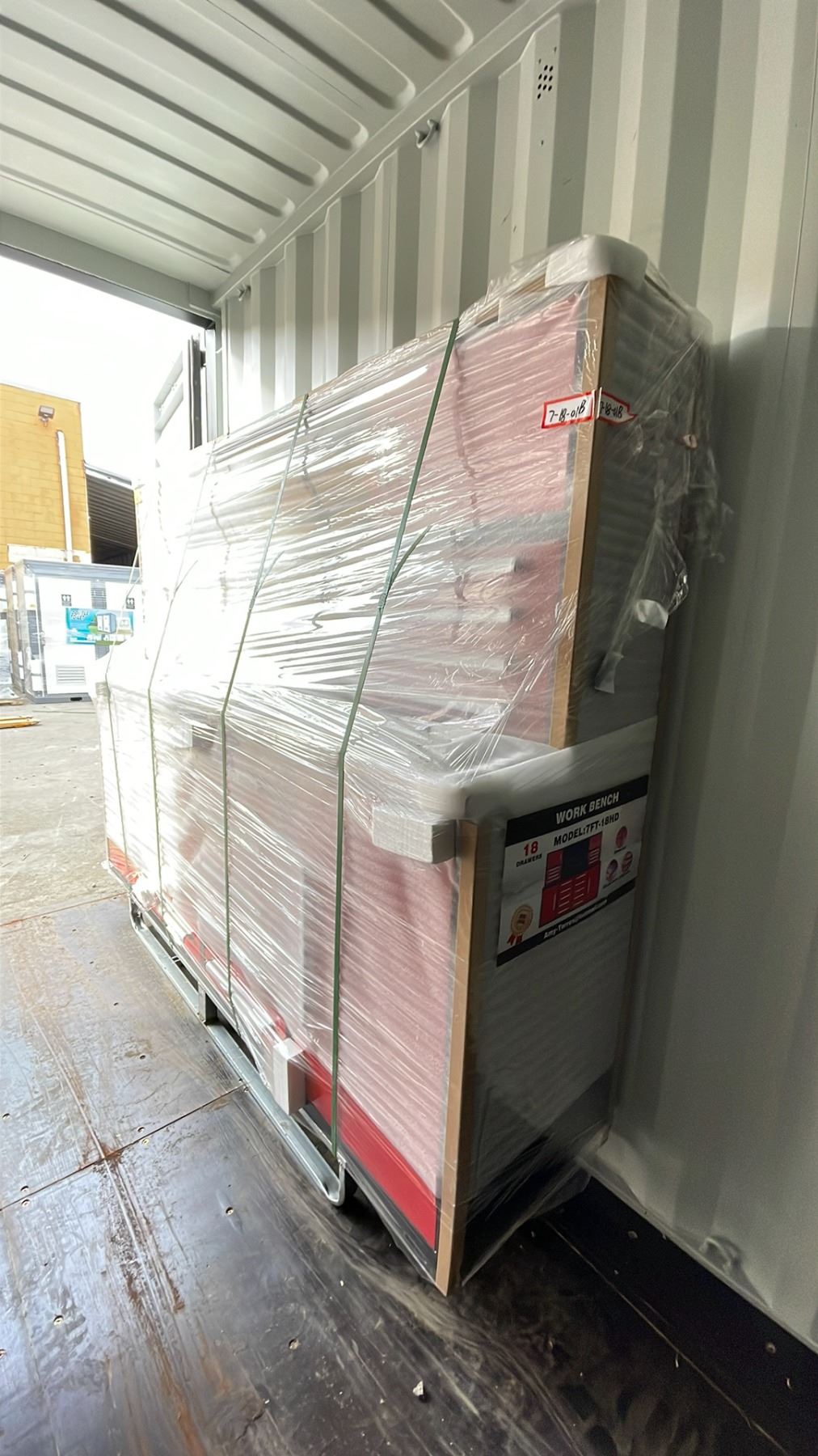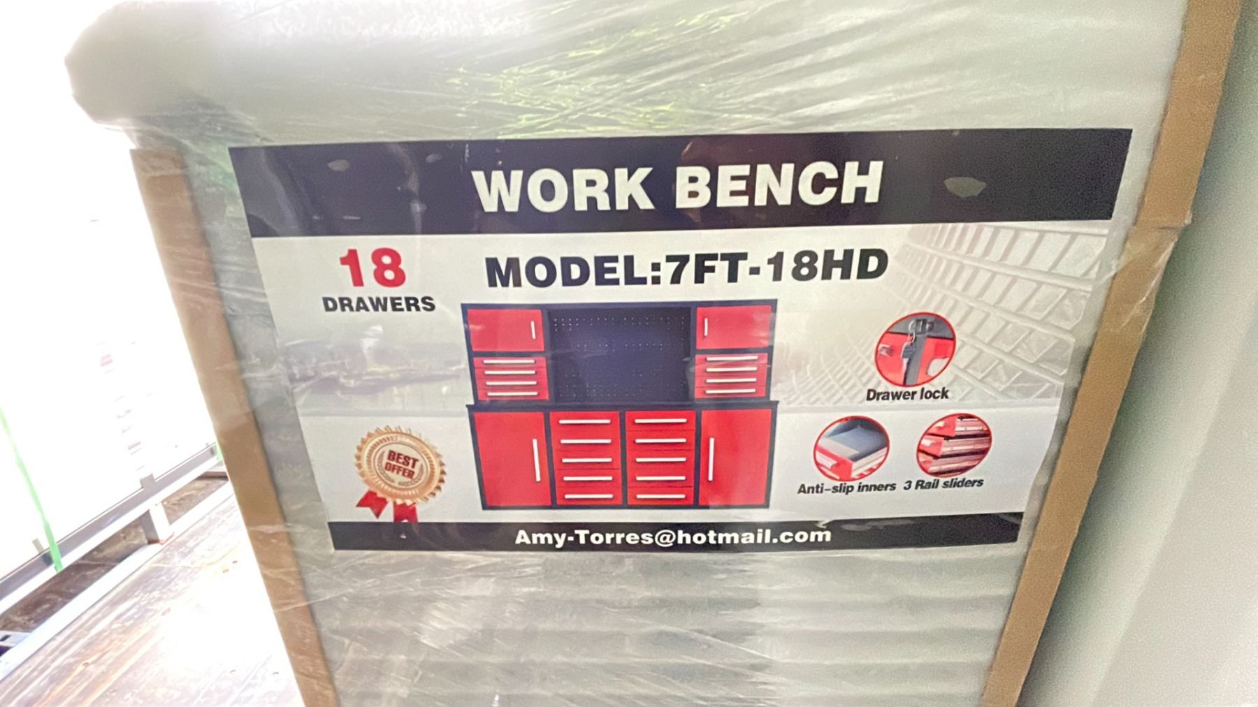 STEELMAN 18 DRAWER/ 2 UPPER CABINET/2 LOWER CABINET 7' RED STAINLESS STEEL FRONT WORKBENCH WITH PEG BOARD