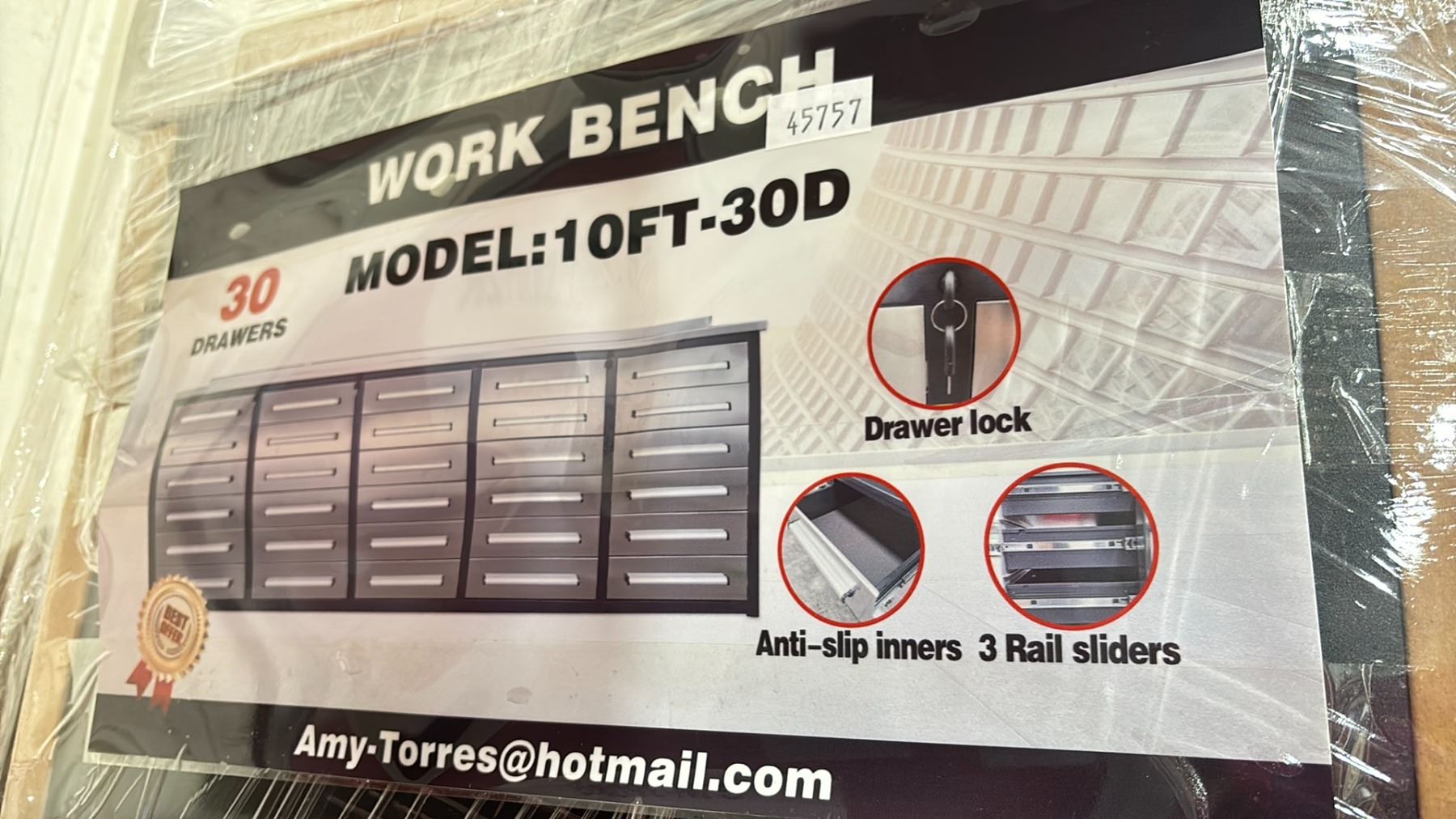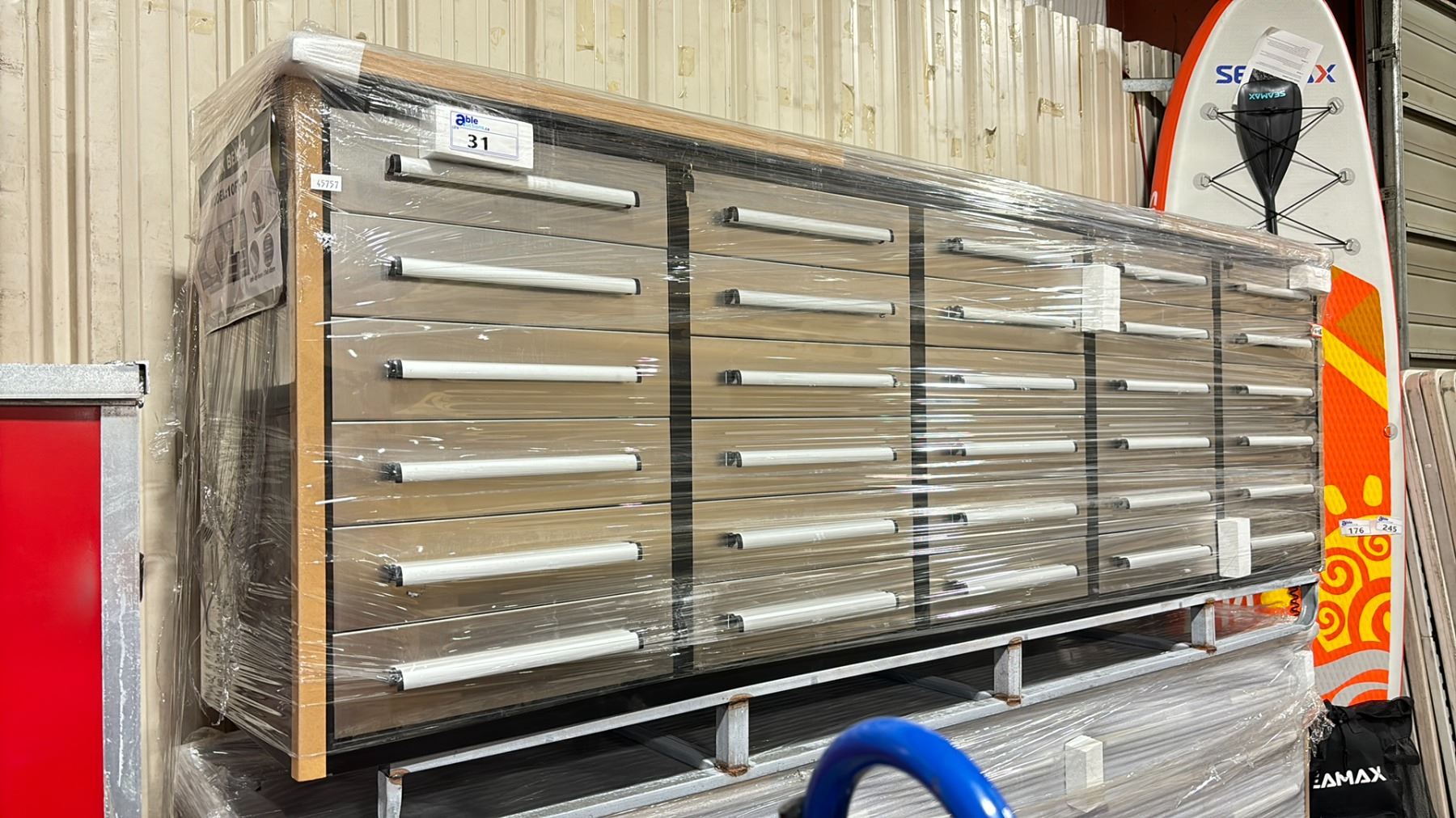 STEELMAN STAINLESS STEEL 30 DRAWER WORKBENCH 36"H X 113"W X 24"D WITH 3 RAIL SLIDERS, DRAWER LOCKS, & ANTI SLIP LINERS