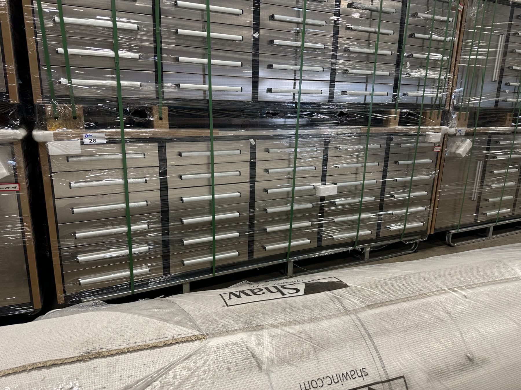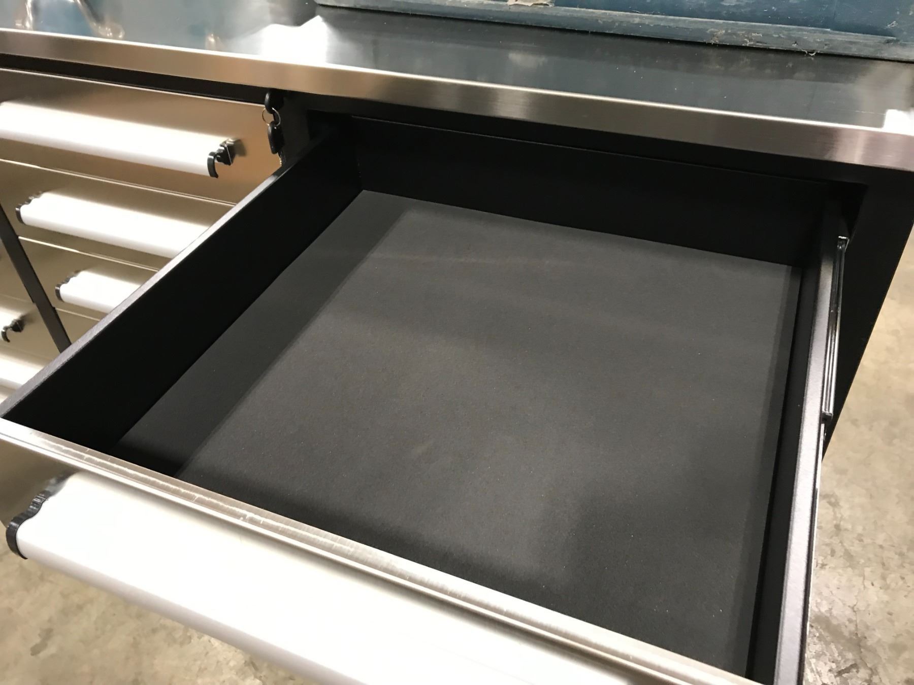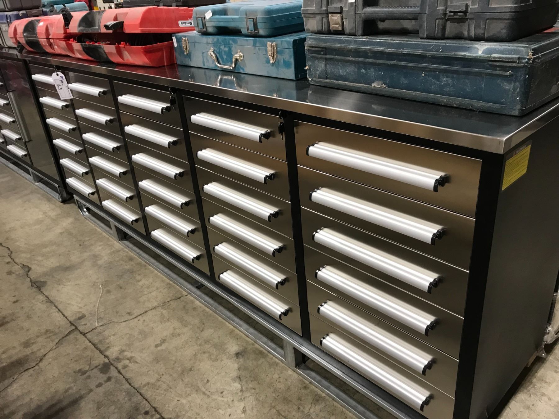 STEELMAN STAINLESS STEEL 30 DRAWER WORKBENCH 36"H X 113"W X 24"D WITH ANTI-SLIP LINING, LOCKING DRAWERS, KEYS, 3 RAIL SLIDERS WITH 35KG CAPACITY PER DRAWER