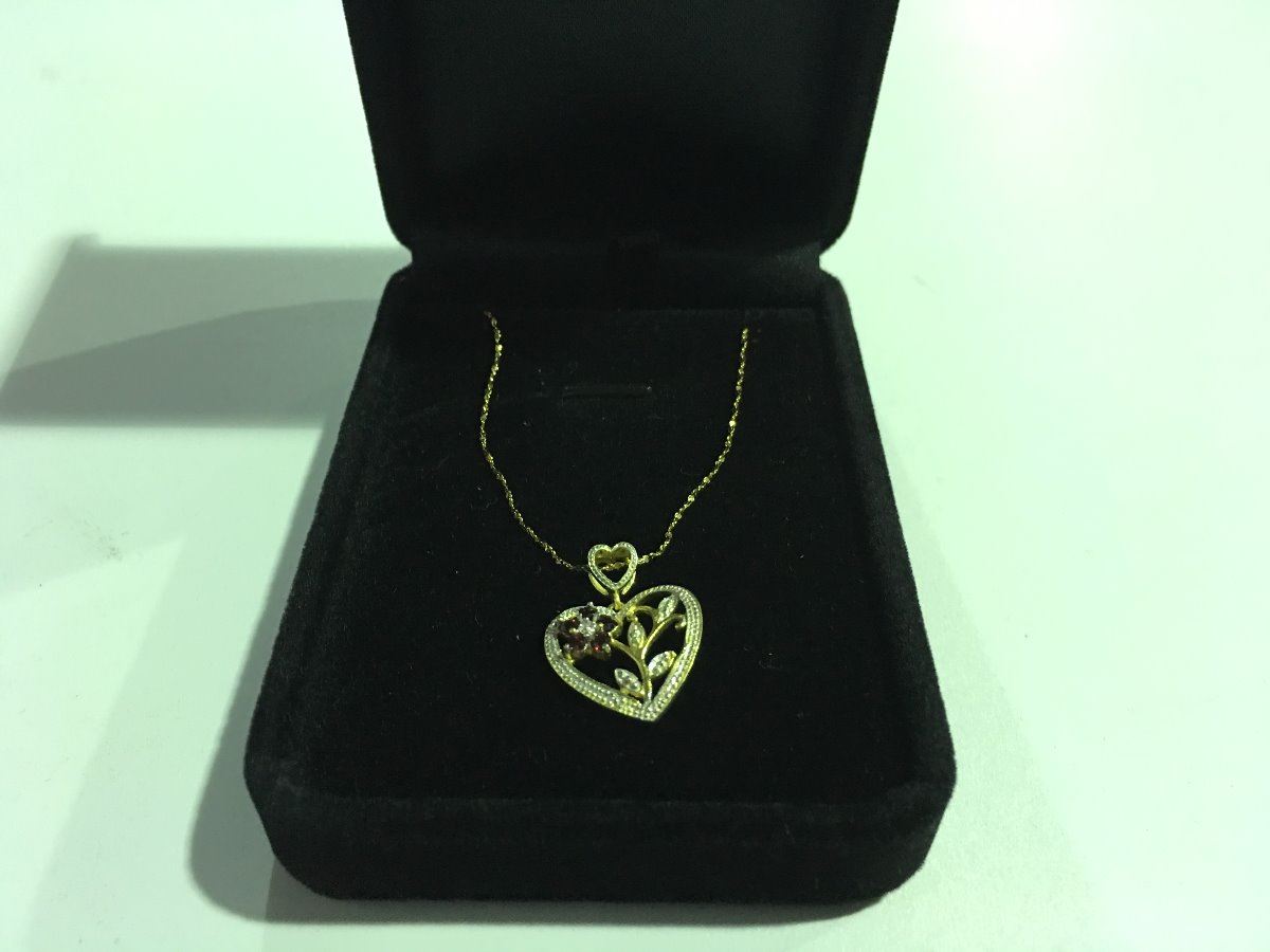 STERLING SILVER & 14K GOLD DIAMOND & GARNET HEART NECKLACE SET RETAIL $225.00
