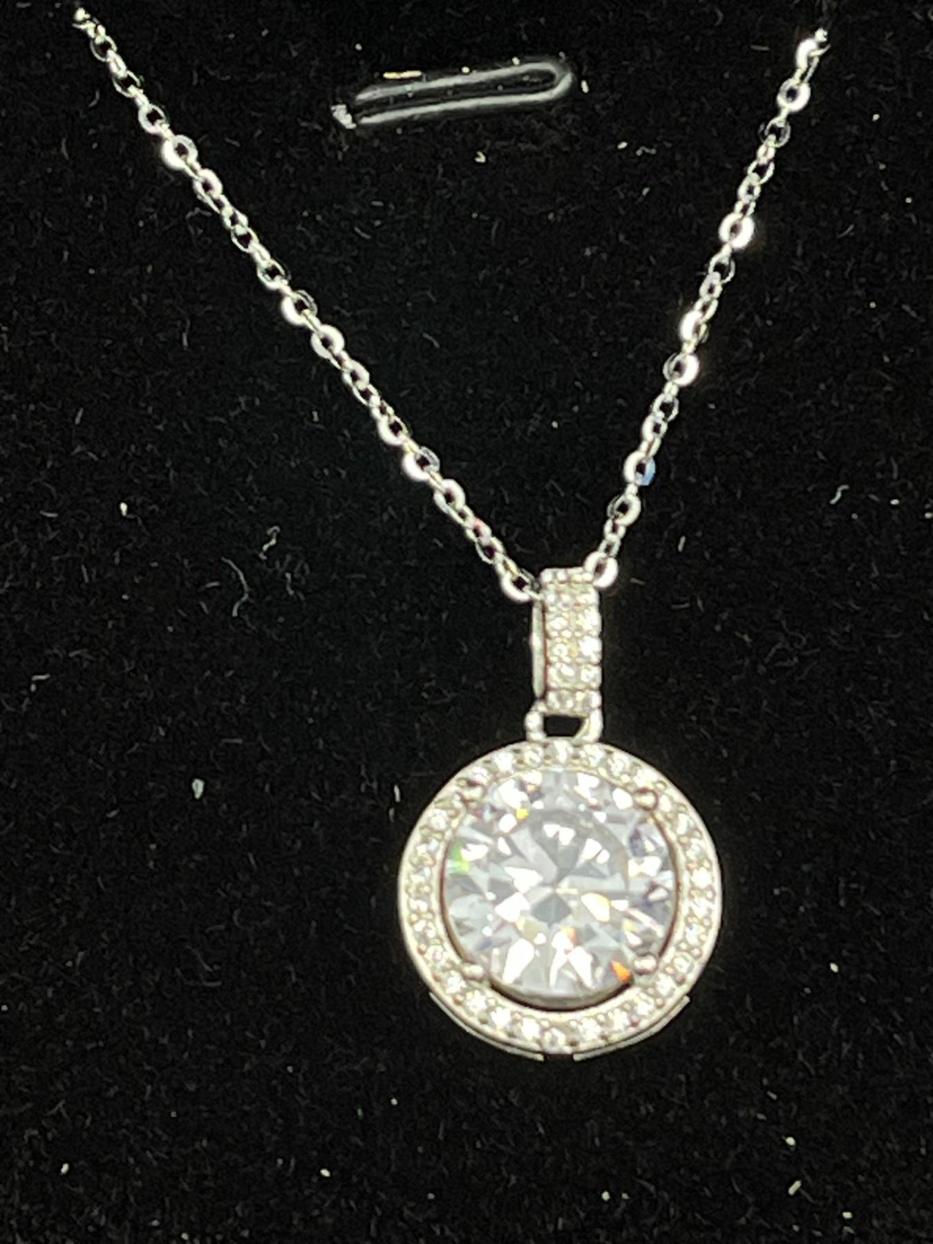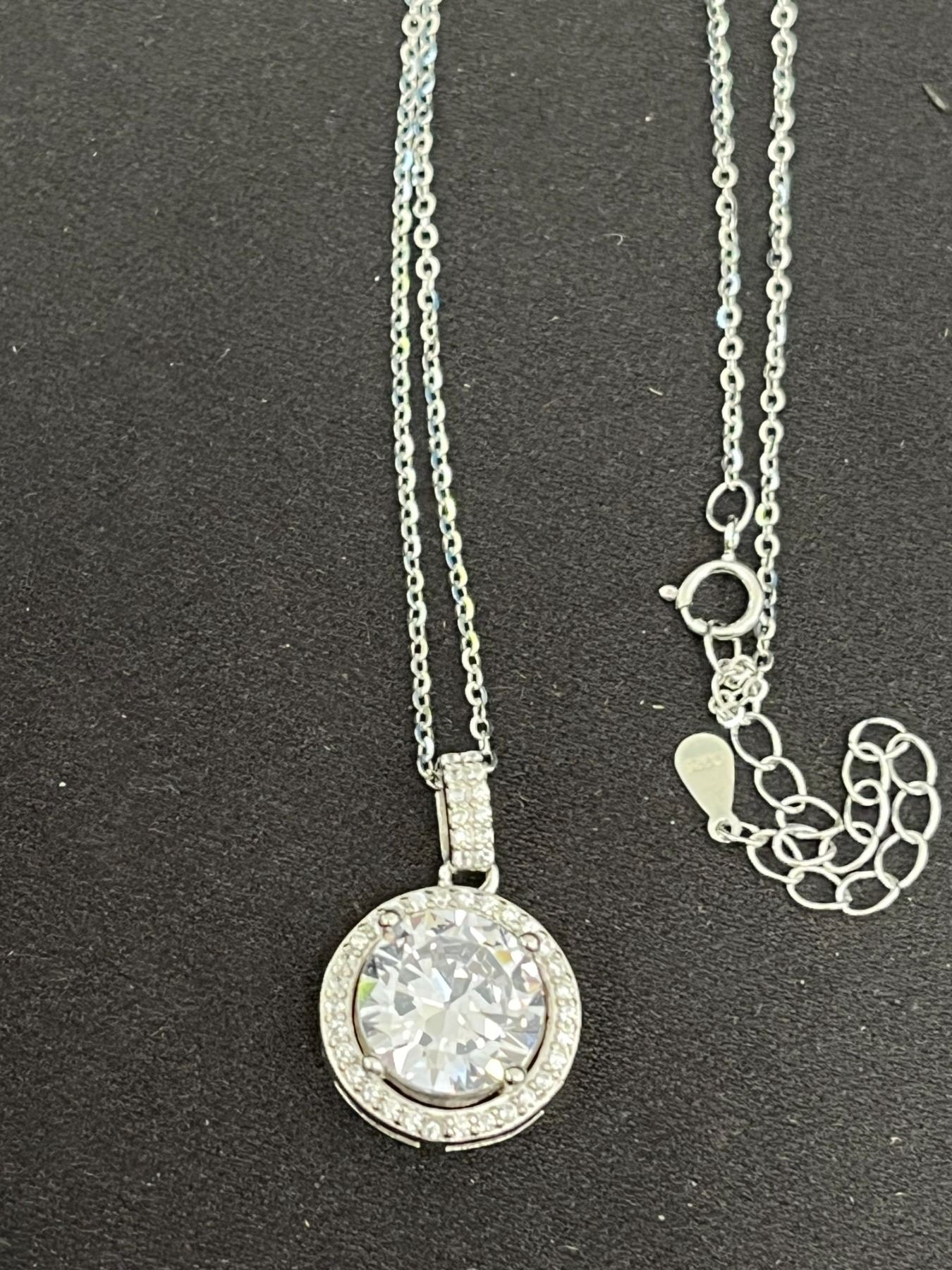 STERLING SILVER 4.0CT HALO NECKLACE, MOUNTED IN 925 STERLING SILVER WITH WHITE GOLD OVERLAY, ADJUSTABLE CHAIN 15" TO 17"