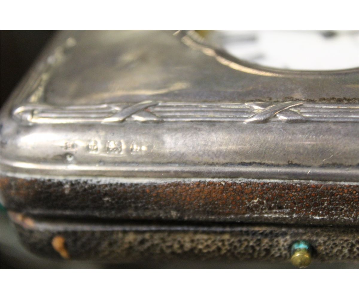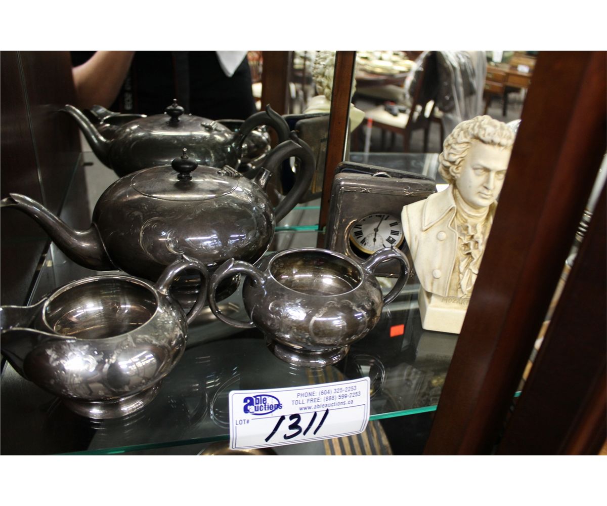STERLING SILVER ARGENTAN POCKET WATCH HOLDER AND SILVER PLATE TEA SET, 3 PIECE