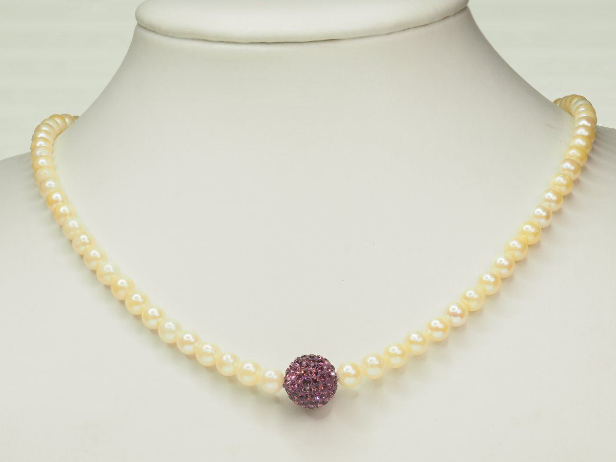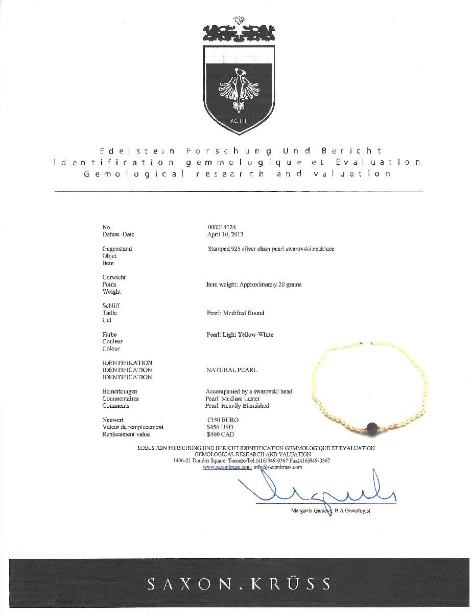 STERLING SILVER CLASP BALL PEARL NECKLACE. REPLACEMENT VALUE: $460.00