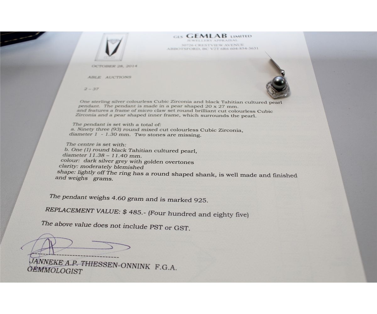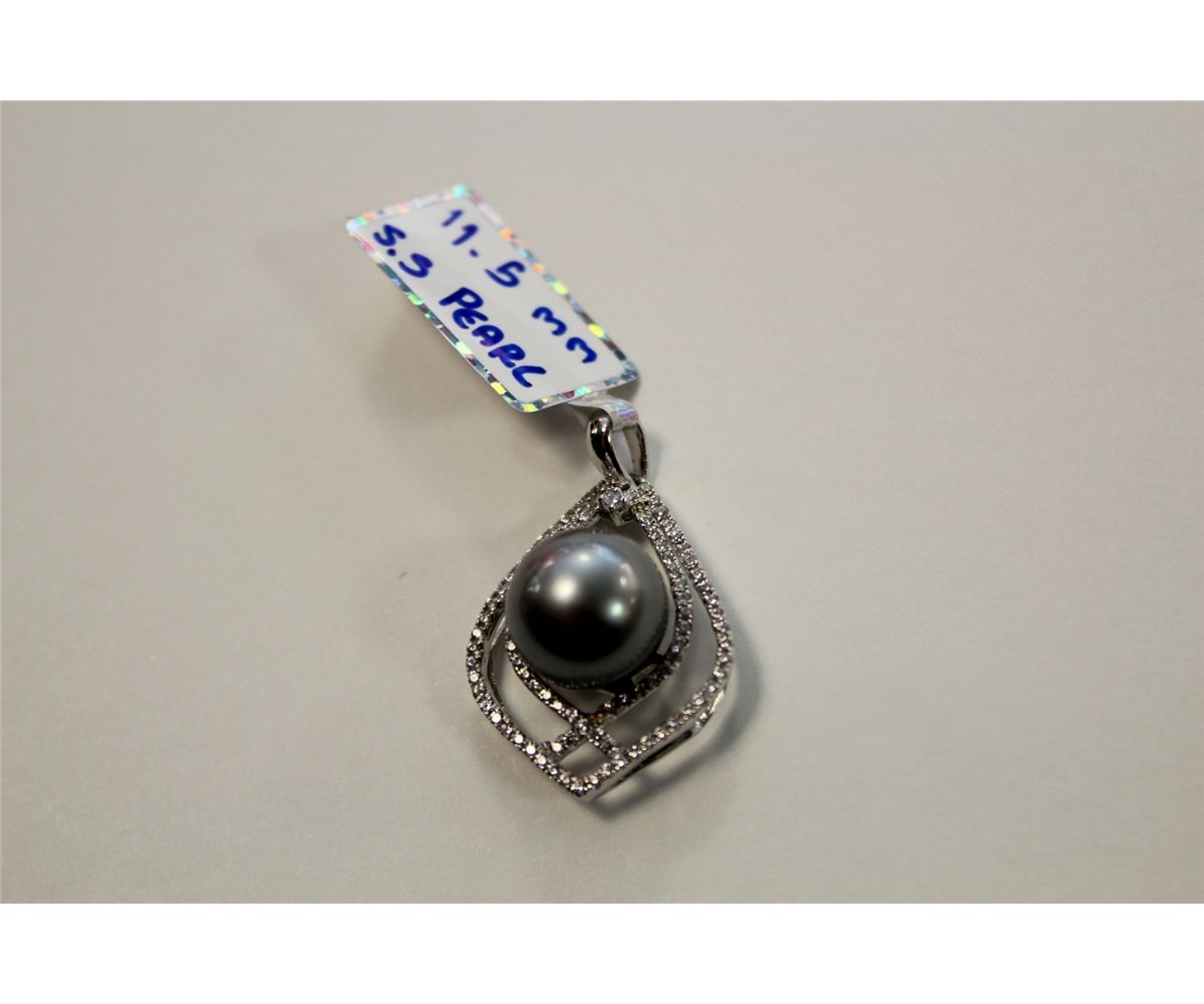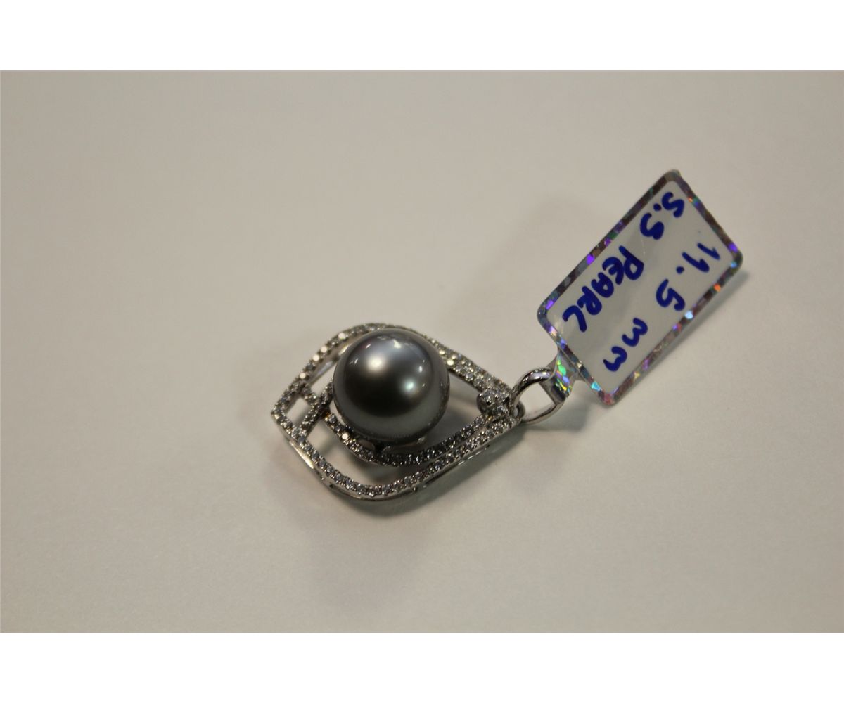 STERLING SILVER COLOURLESS CUBIC ZIRCONIA AND BLACK TAHITIAN CULTURED PEARL PENDANT. SET WITH A TOTAL OF 93 ROUND MIXED CUT COLOURLESS CUBIC ZIRCONIA AND 1 ROUND BLACK TAHITIAN CULTURED PEARL. MARKED .925 REPLACEMENT VALUE: $485.00