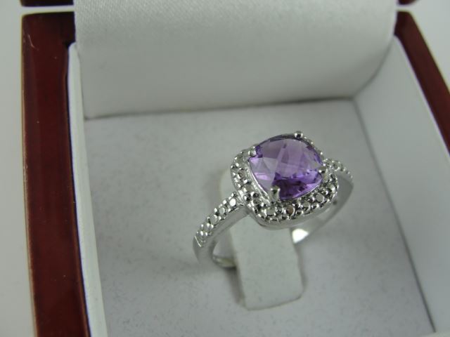 STERLING SILVER CUSHION CUT PURPLE AMETHYST AND DIAMOND DINNER RING