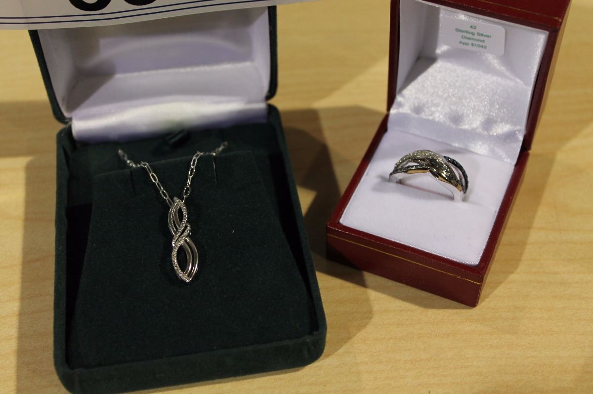 STERLING SILVER DIAMOND PENDANT (1.80G) APPRAISED $861, STERLING SILVER DIAMOND (0.34CT) RING (5.46G) APP 44 DIAMONDS APPRAISED $1042