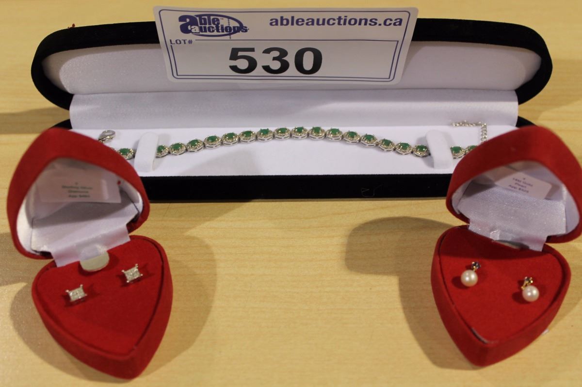STERLING SILVER EMERALD BRACELET (10.47G) APPRAISED $967, STERLING SILVER DIAMOND EARRINGS (1.58G) APPRAISED $463, 14KT GOLD PEARL IOLITE EARRINGS APPRAISED $325"