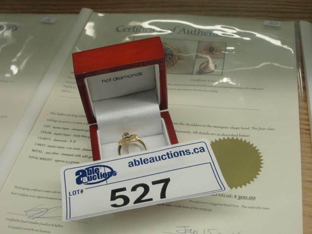 STERLING SILVER & GOLD FINISH 2CT MYSTIC TOPAZ & DIAMOND DINNER RING. INCLUDES A $300.00 CERT