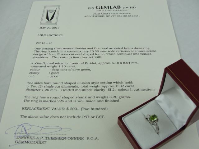 STERLING SILVER NATURAL PERIDOT AND DIAMOND ACCENTED LADIES DRESS RING WITH ONE PERIDOT, APPROX 1.10CARAT REPLACEMENT VALUE $200