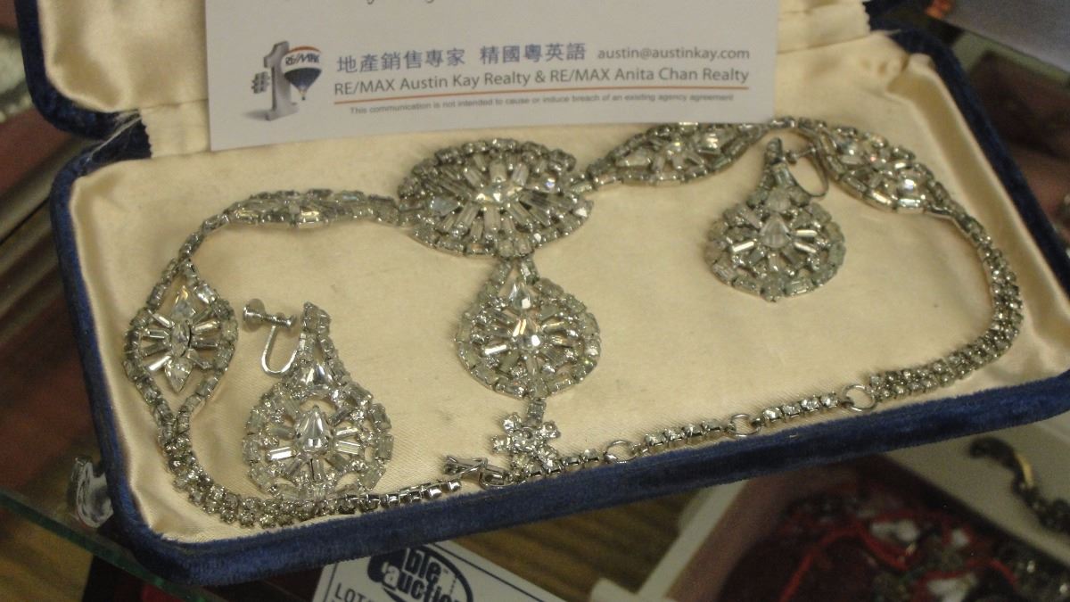 STERLING SILVER NECKLACE AND EARRING SET WITH RHINESTONES CA 1925-1930, WITH CASE