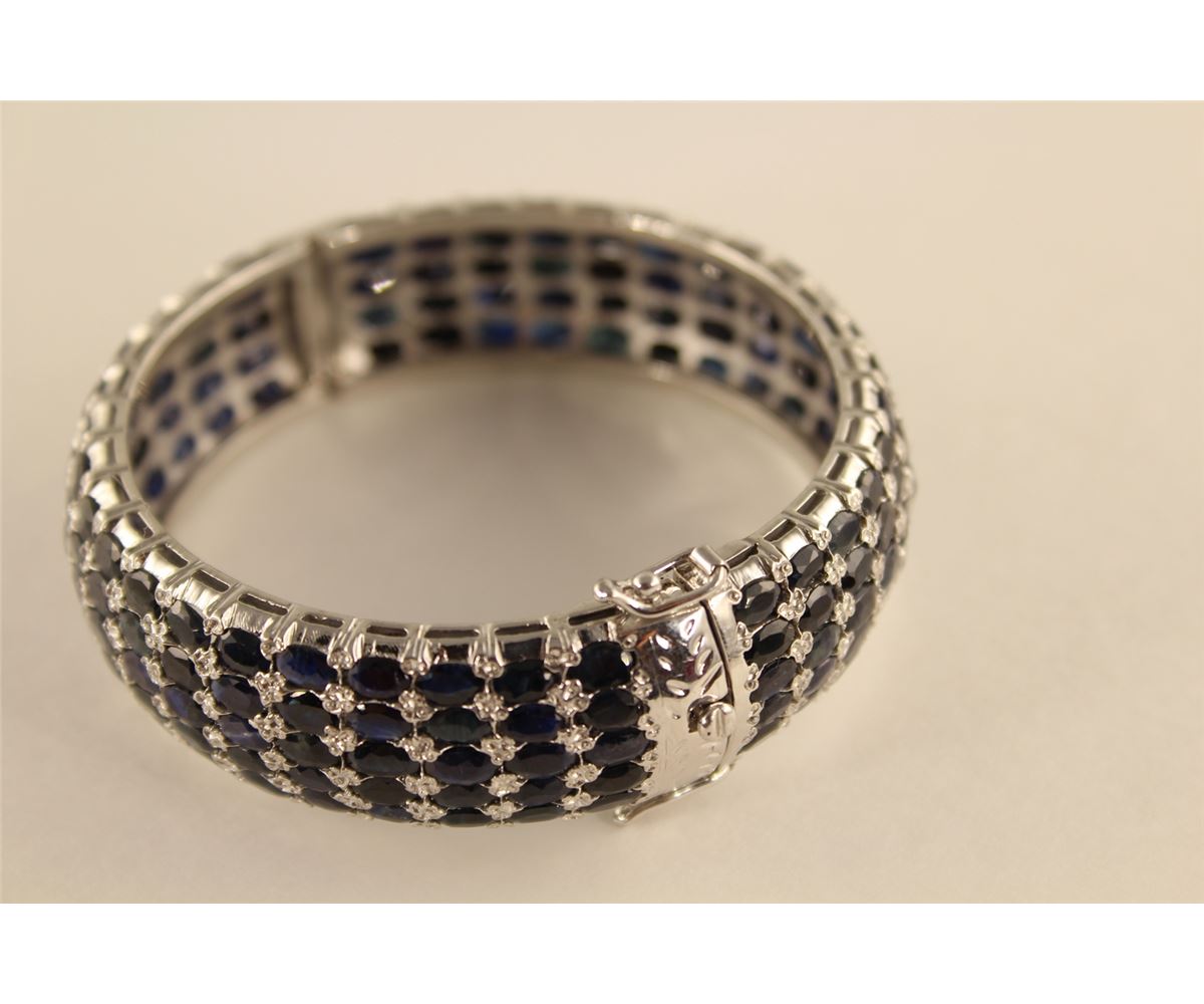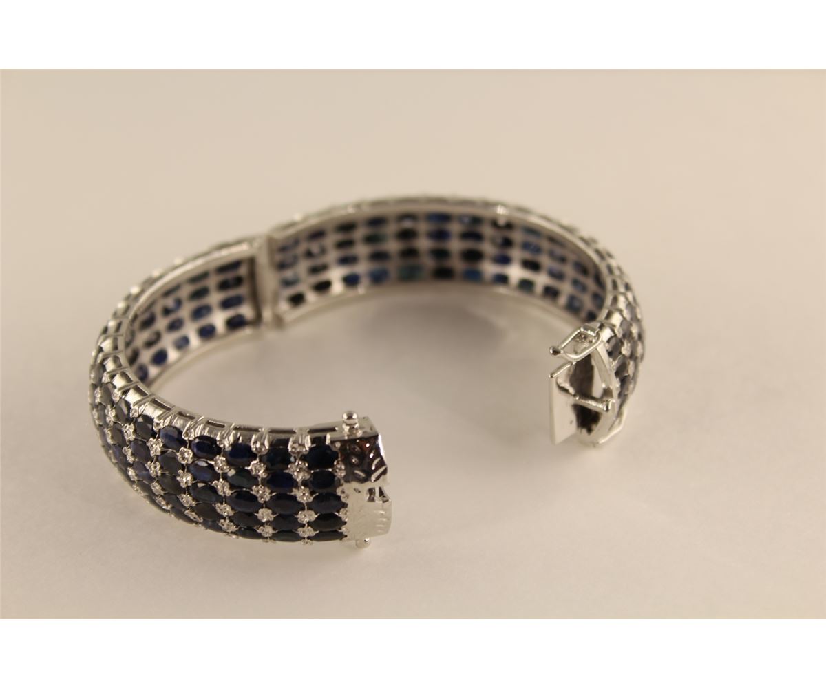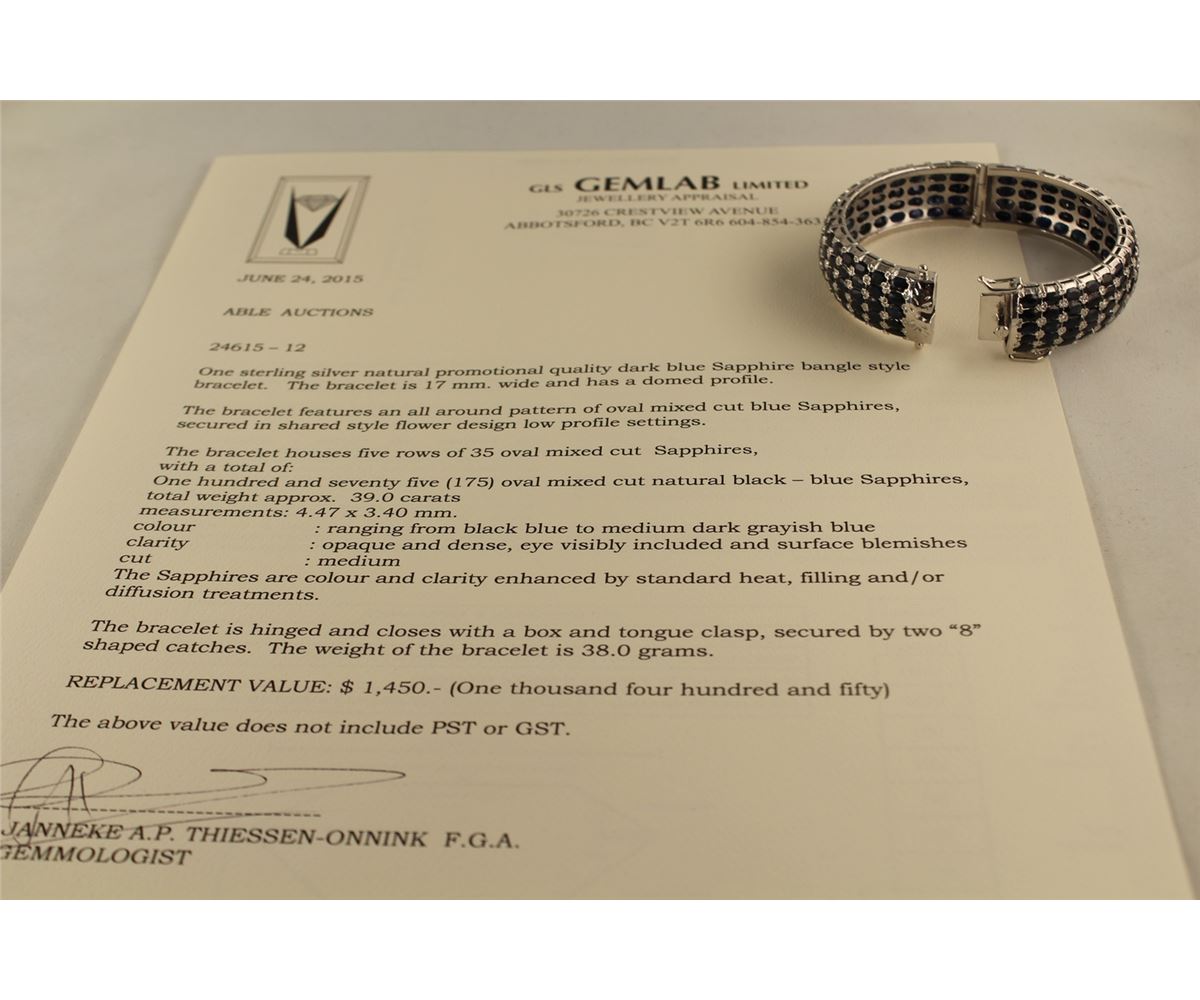 STERLING SILVER & SAPPHIRE BRACELET.  BRACELET HOUSES FIVE ROWS OF 35 OVAL MIXED CUT SAPPHIRES IN A FLOWER STYLE DESIGN WITH 35 OVAL MIXED CUT SAPPHIRES . TOTAL OF 175 OVAL MIXED CUT NATURAL BLACK-BLUE SAPPHIRES APPROX. 39.0 CARATS.  REPLACEMENT VALUE:$1450.00