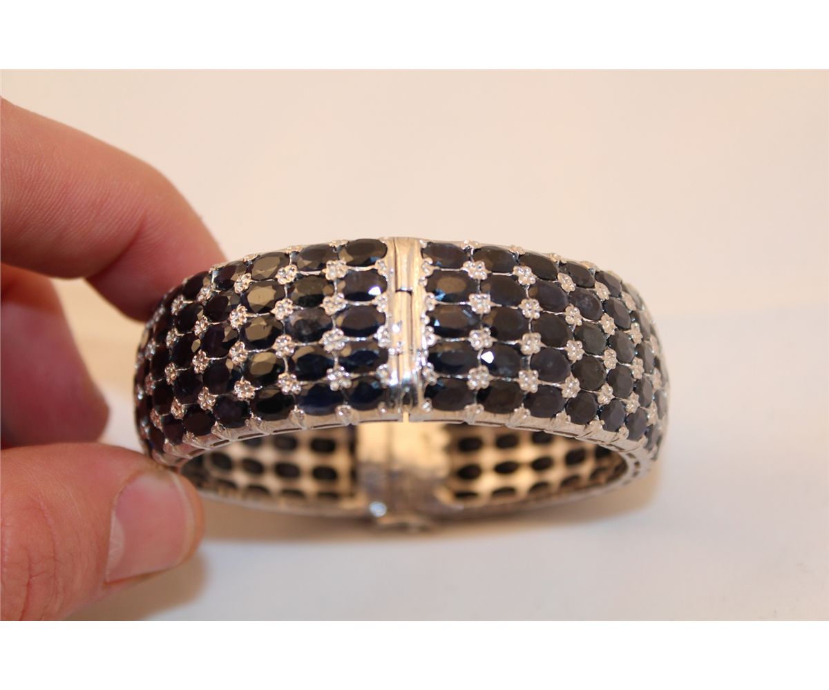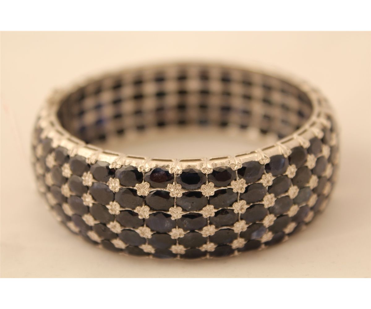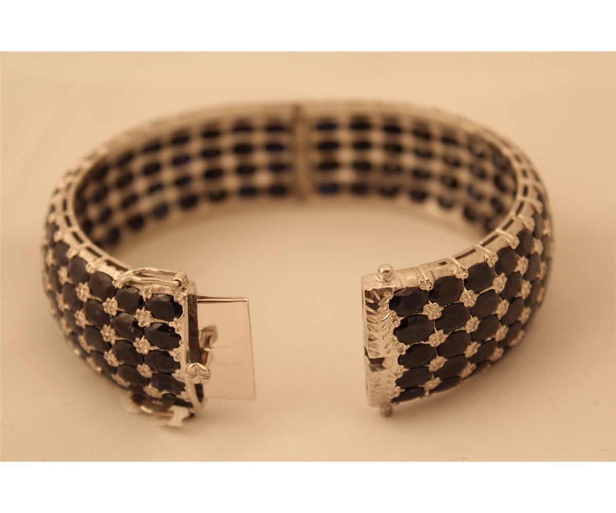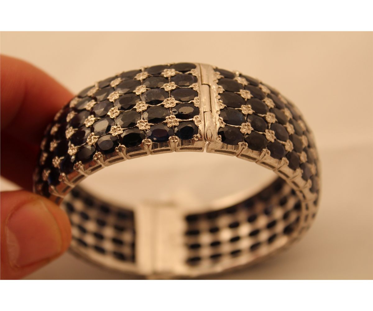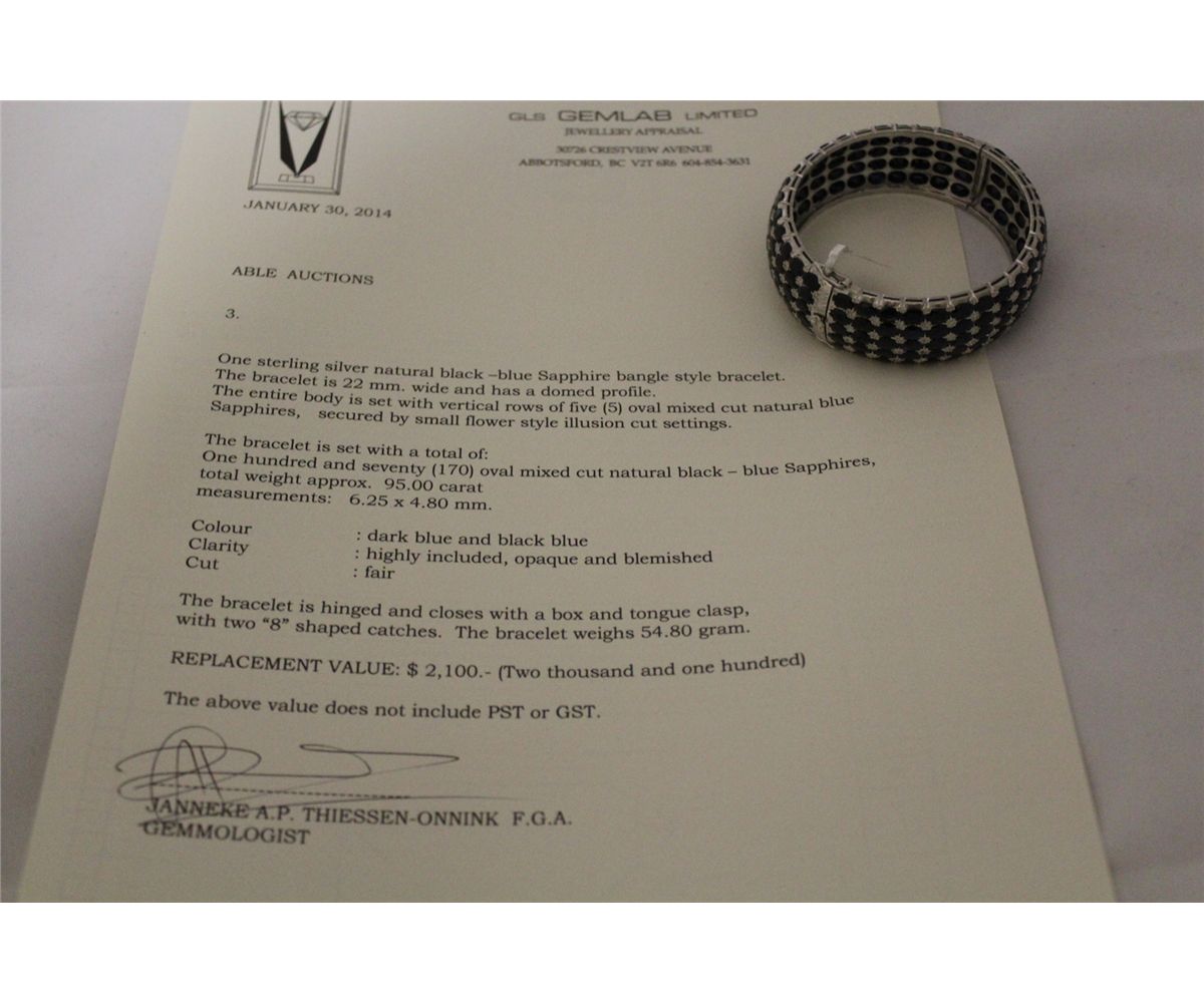 STERLING SILVER SAPPHIRE BRACELET. STAMPED 925 SILVER, INCLUDES APPROX. 95.00 CT GEMSTONE WEIGHT. ITEM WEIGHT: 54.82 GRAM GEMSTONES: 170 NATURAL BLACK-BLUE SAPPHIRE, OVAL HEAVILY INCLUDED-SLIGHTLY INCLUDED, DARK BLUE INCL. GEMOLOGIST APPRAISAL WITH REPLACEMENT VALUE OF $2,100