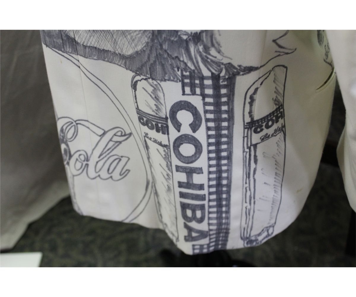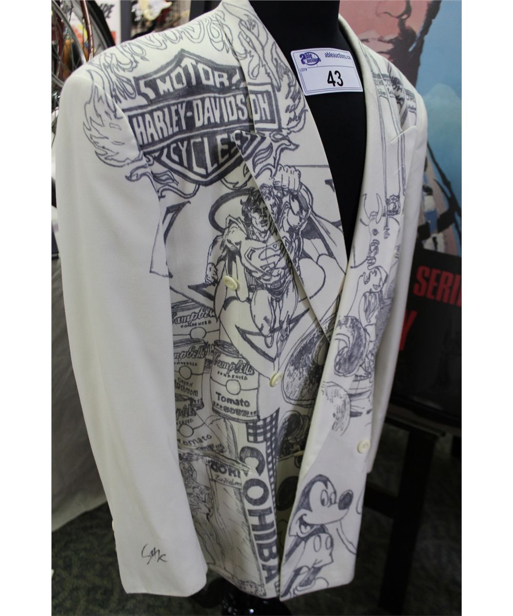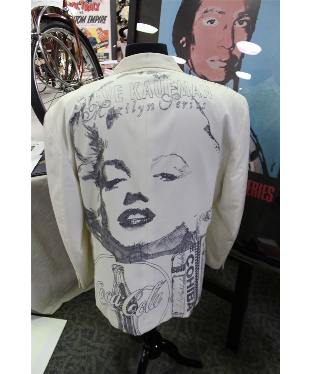 STEVE KAUFMAN ORIGINAL DRAWN BLAZER FEATURING ICONIC POP ART IMAGERY SUCH AS: COCA-COLA, MICKEY MOUSE, MARILYN MONROE, ANDY WARHOL CAMPBELL SOUP AND MORE. THIS JACKET IS FEATURED ON PAGE 11 OF THE STEVE KAUMAN BOOK. ORIGINALLY PURCHASED THROUGH CENTAUR GALLERIES IN LAS VEGAS AT A CHARITY GALA. INCLUDES A SIGNED COPY OF THE BOOK