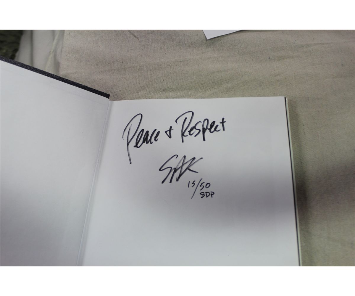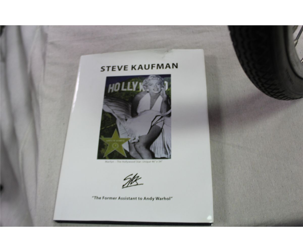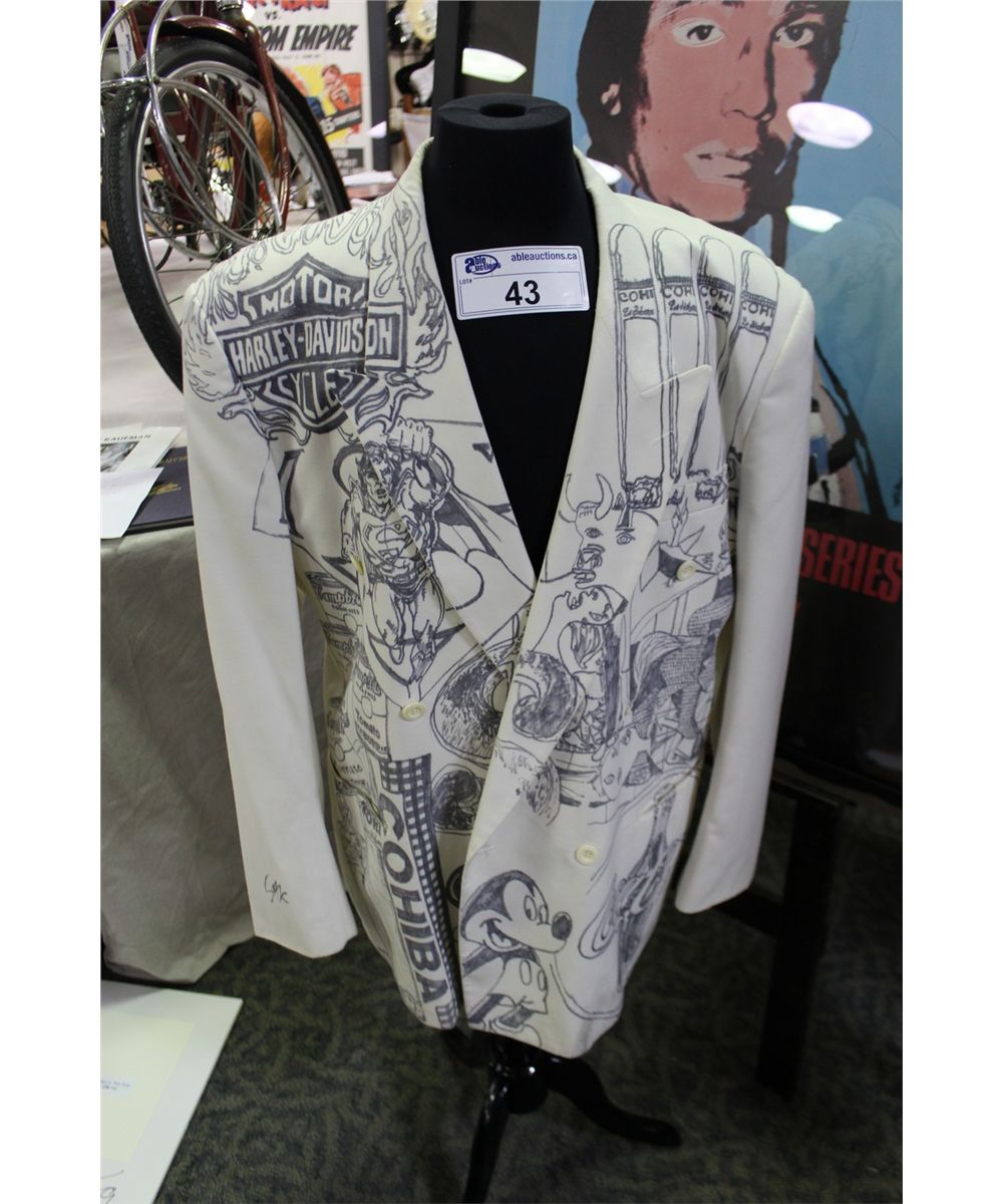 STEVE KAUFMAN ORIGINAL DRAWN BLAZER FEATURING ICONIC POP ART IMAGERY SUCH AS: COCA-COLA, MICKEY MOUSE, MARILYN MONROE, ANDY WARHOL CAMPBELL SOUP AND MORE. THIS JACKET IS FEATURED ON PAGE 11 OF THE STEVE KAUMAN BOOK. ORIGINALLY PURCHASED THROUGH CENTAUR GALLERIES IN LAS VEGAS AT A CHARITY GALA. INCLUDES A SIGNED COPY OF THE BOOK