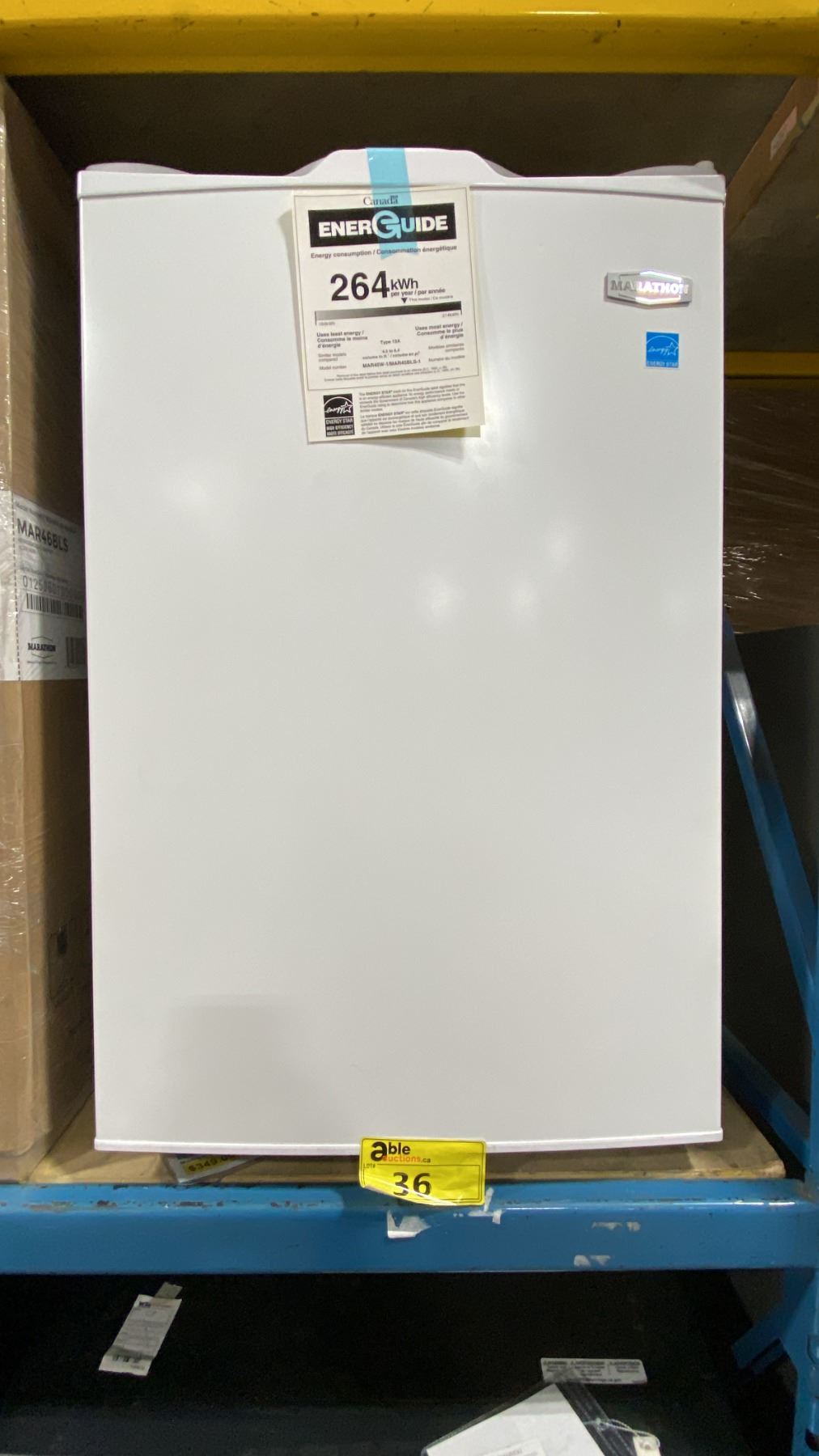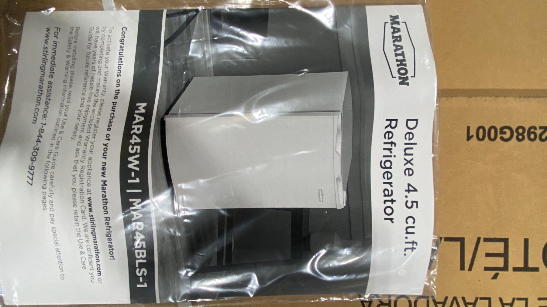 STIRLING MARATHON MODEL MAR45W-1. WHITE 4.5 CU. FT. DELUXE COMPACT BAR REFRIGERATOR SN 14230704000064 RETAIL PRICE $449.00
