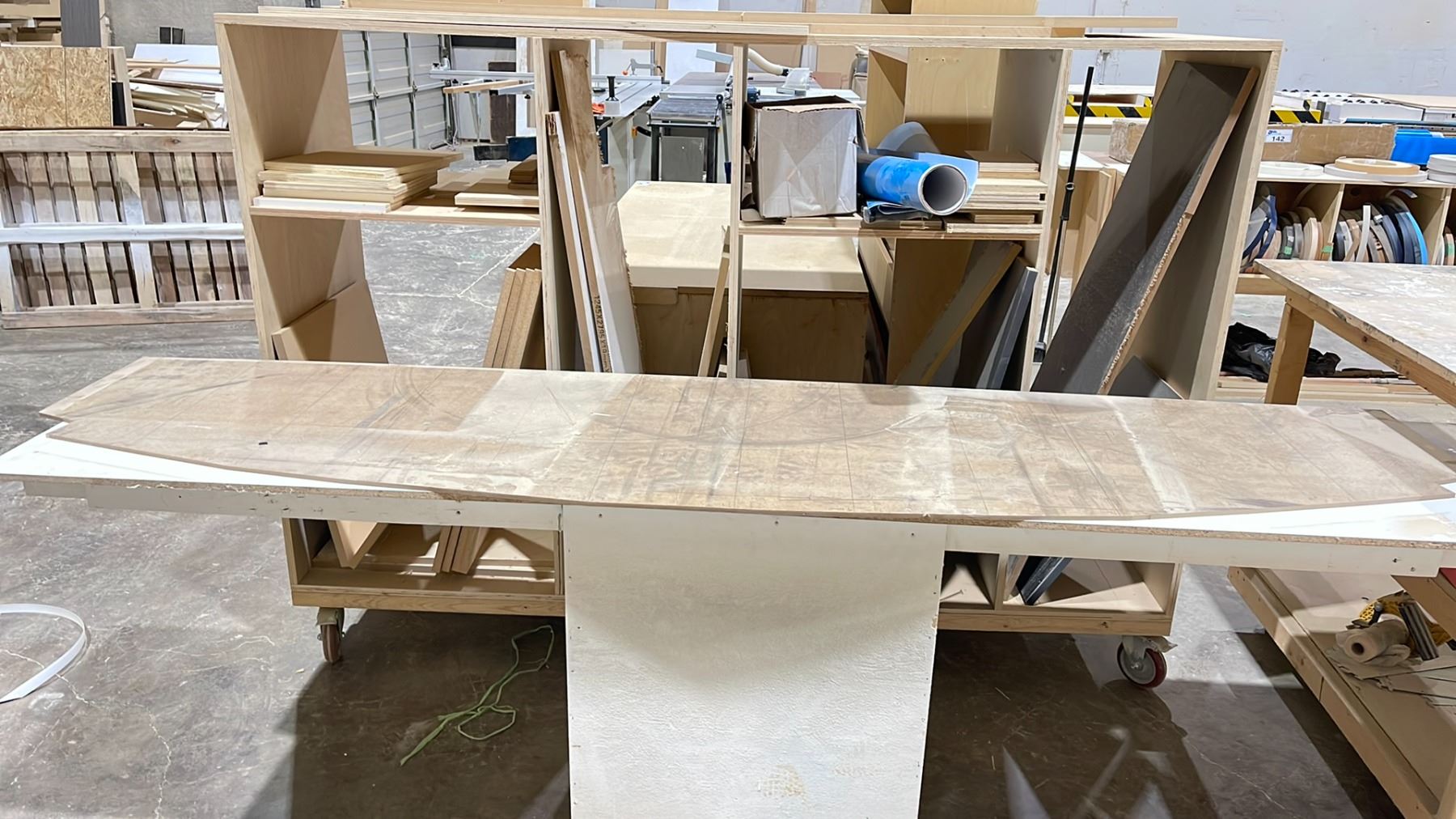 STOCK TABLE ON WHEELS & CABINET & CONTENTS