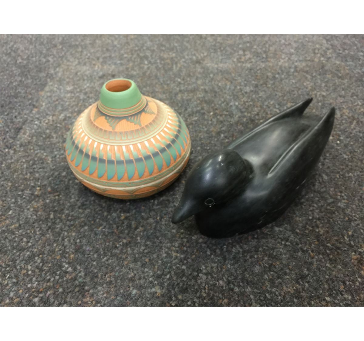 STONE BIRD CARVING AND NAVAJO CERAMIC