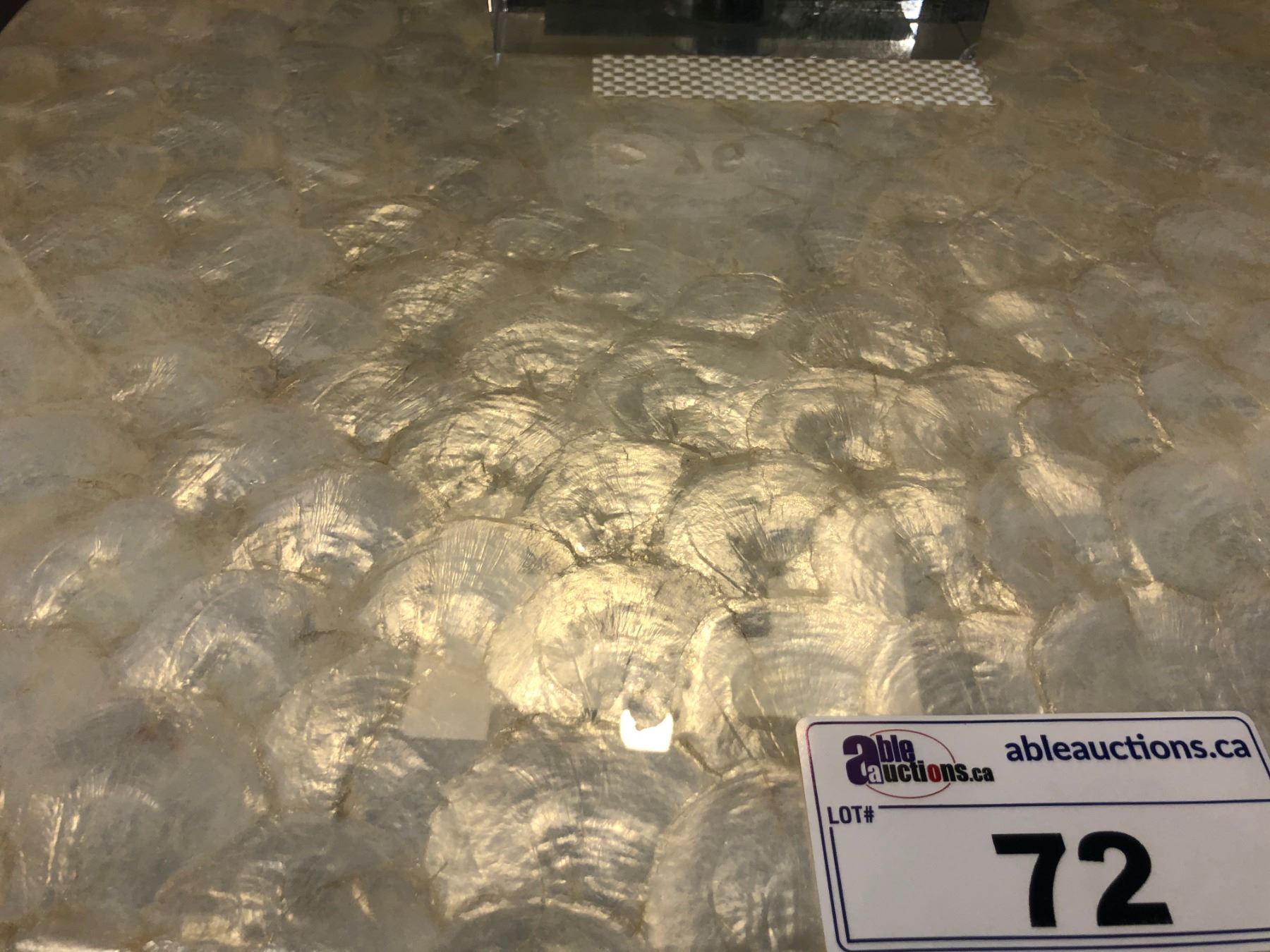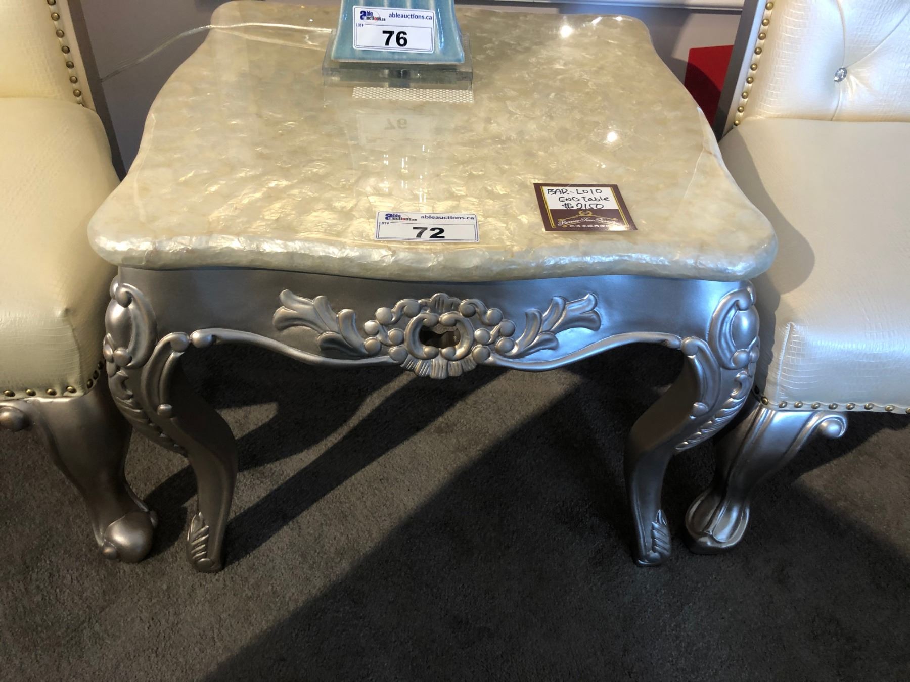 STONE TOP WITH WOODEN BASE ACCENT TABLE. RETAIL $2,150.00