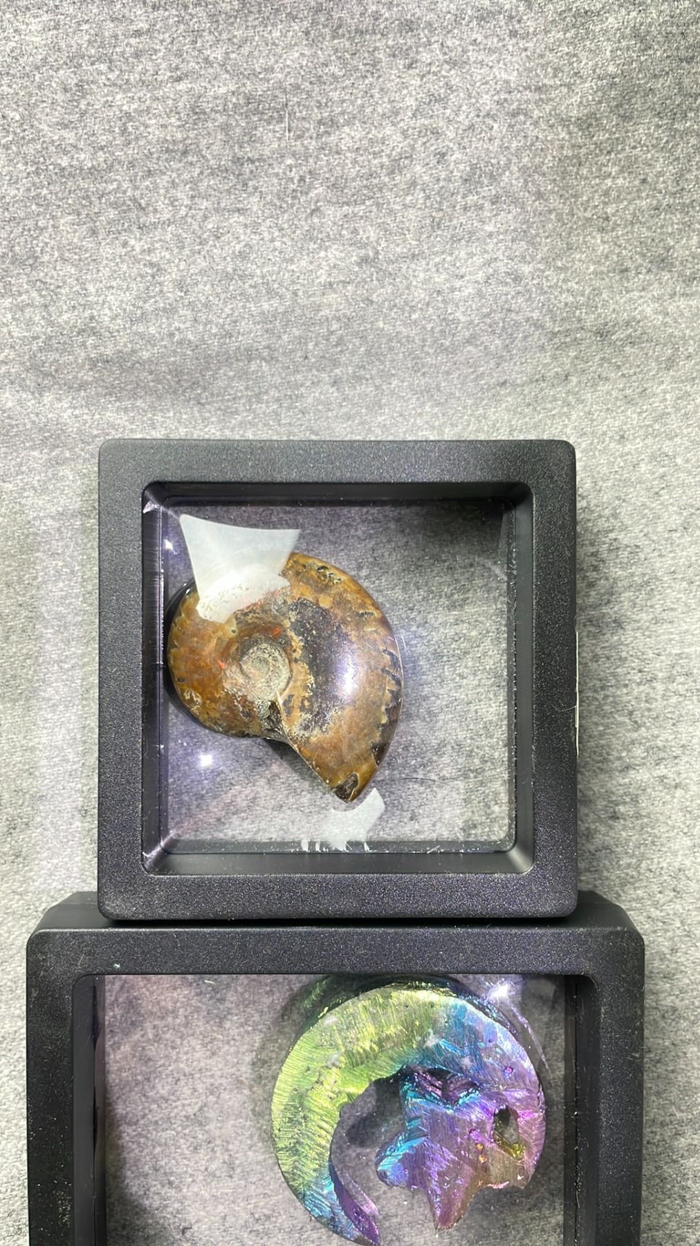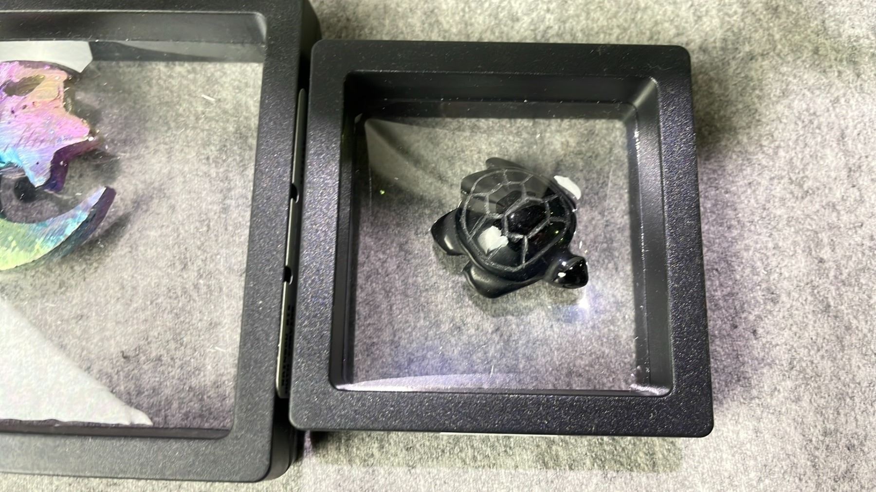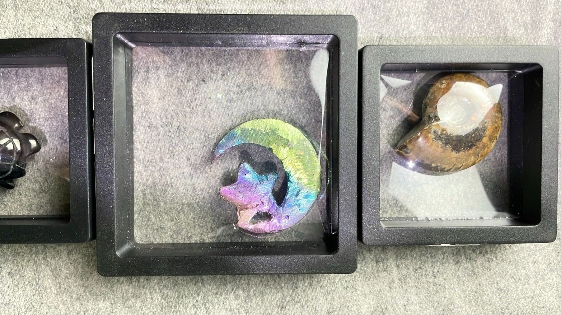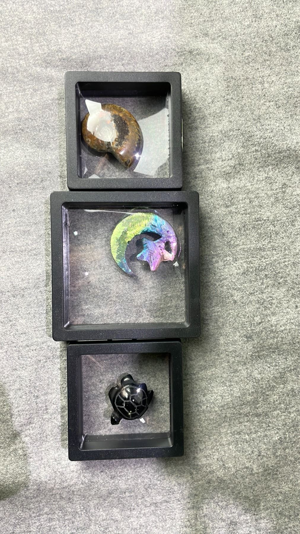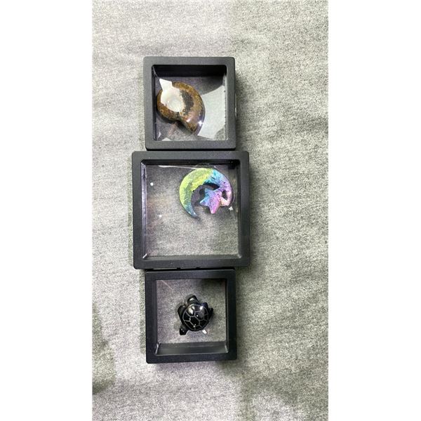 STONE TURTLE CARVING, AMMONITE FOSSIL SPECIMEN & RAINBOW BISMUTH CARVING