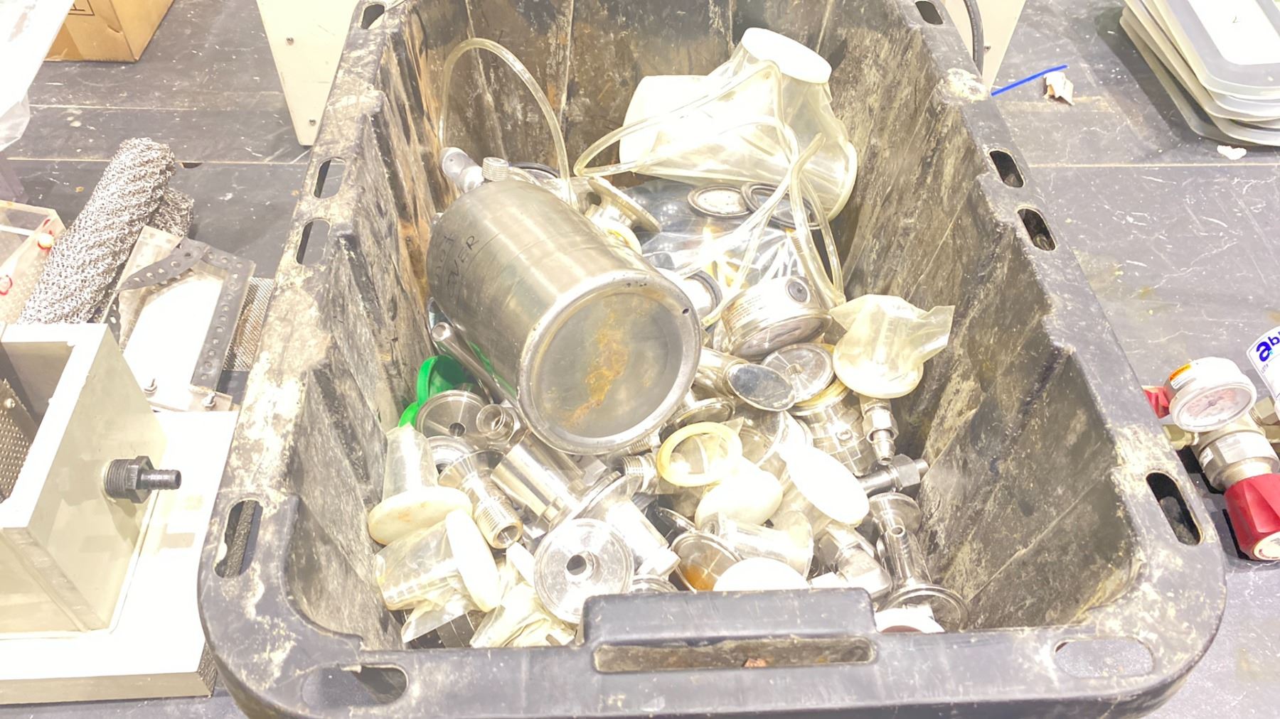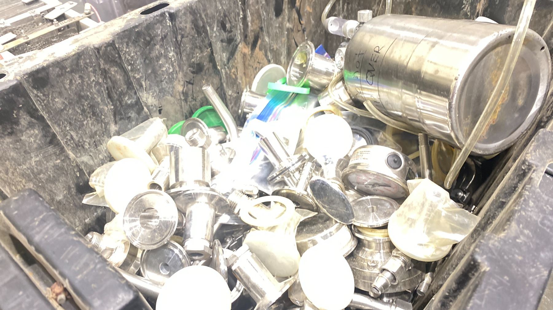 STORAGE BIN OF ASSORTED STAINLESS STEEL FITTINGS & ASSORTED GAUGES (FOR HOME BREW OR LABORATORY)