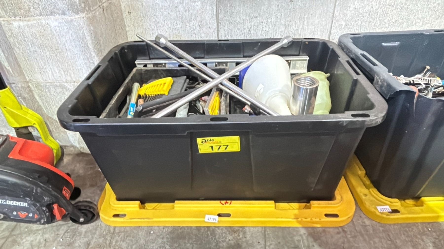 STORAGE BIN OF INDUSTRIAL GOODS - BATTERY, LEVELS, SAW, SMALL HAND TOOLS, ALAN KEYS, GREASE GUNS, FUNNELS & MORE *BIN INCLUDED*
