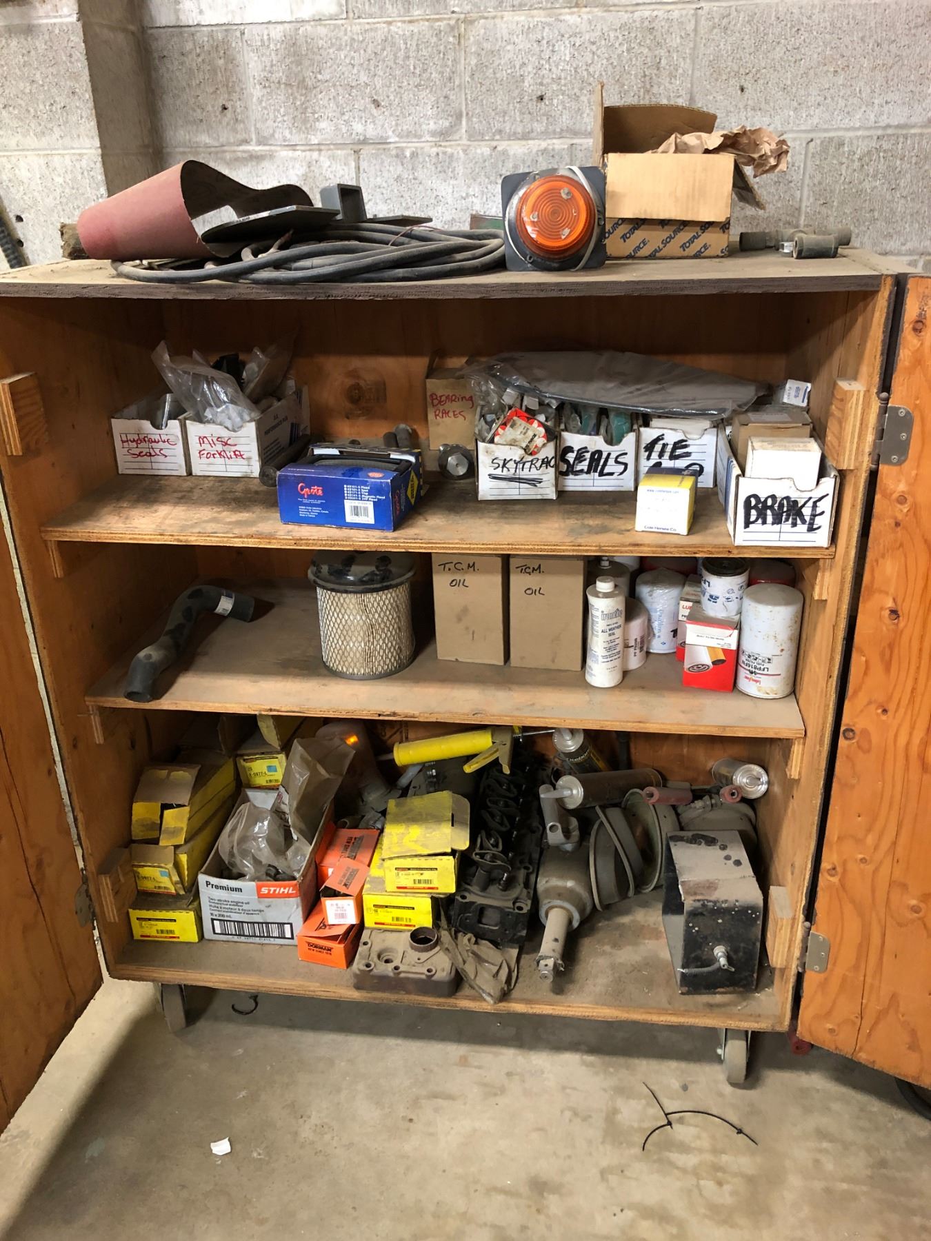 STORAGE CABINET & CONTENTS: SEALS, TIE RODS, PARTS & MORE